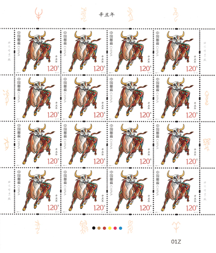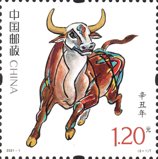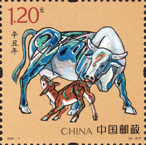 《辛丑年》特种邮票通过动与静、力量与温情的结合,将生肖牛“脚踏实地、敢于拼搏、开拓进取、勤劳奉献”的精神内涵进行了生动诠释与艺术展现。两枚邮票分别展示了国家的期许、家庭的企盼,组合而成浓浓的新春祝福;其中,第一枚“奋发图强”,描绘了雄壮有力、一往无前的奔牛形象,公牛四蹄扬起,昂首向前,目光炯炯,表达出不畏艰险、砥砺前行,为实现中华民族伟大复兴而努力奋斗的寓意;第二枚“牛年大吉”,通过大牛与小牛舐犊情深的温馨画面,向全国人民传递家庭兴旺和谐、团圆美满的美好祝愿。