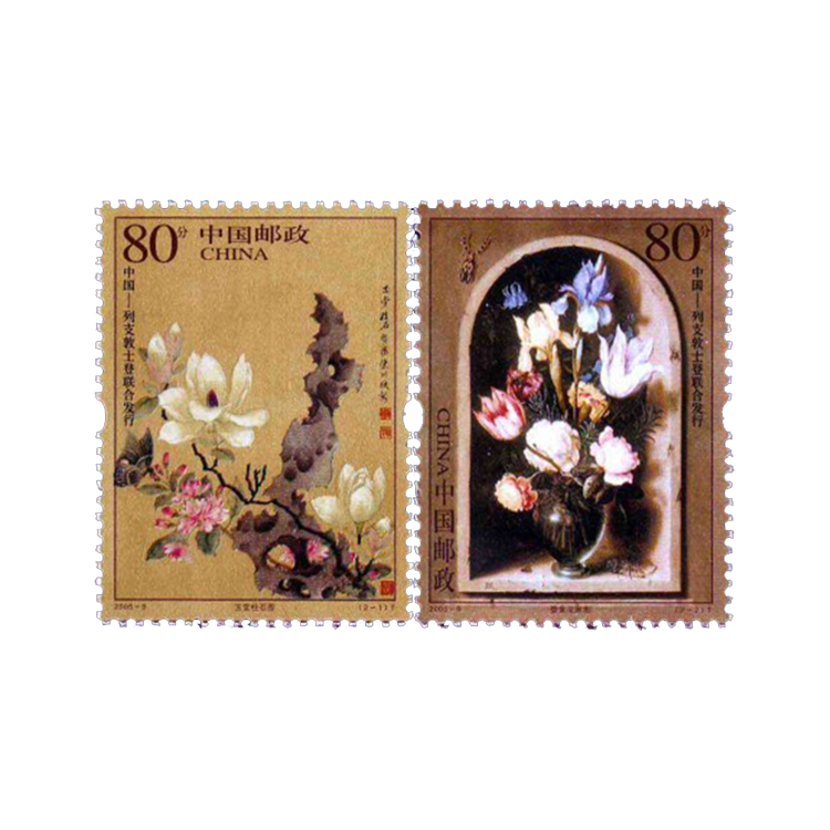 2005年是中华人民共和国和列支敦士登公国建交55周年,为此国家邮政局于5月18日与列支敦士登邮政部门联合发行《绘画作品》特种邮票一套两枚:一枚为浙江省诸暨籍明代著名画家陈洪绶的《玉堂柱石图》,一枚为列支敦士登17世纪静物画大师阿姆布罗西乌斯·博斯舍尔特的《壁龛花束图》,面值均为80分。