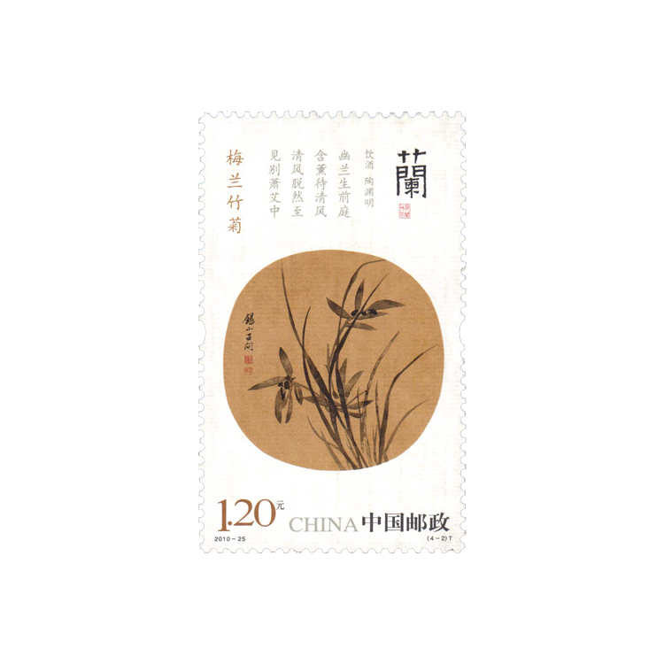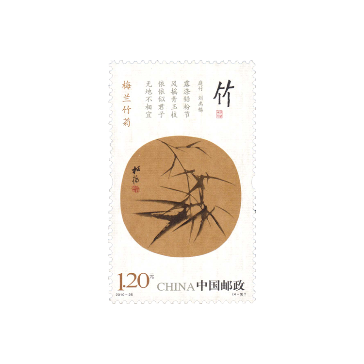 《梅兰竹菊》特种邮票以经典的诗词和绘画为主要表现形式。梅兰竹菊,占尽春夏秋冬。梅高洁傲岸,兰幽雅空灵,竹虚心有节,菊冷艳清贞。“梅”邮票主图选自清代“扬州八怪”画家金农的《画梅花册》,此画现藏于北京故宫博物院,金农尤精画梅,格调拙厚淳朴,树姿苍劲,暗香浮动,独占春光。“兰”邮票主图选用巢勋在上海有正书局以石印法影印出版的《芥子园画谱》,返璞归真,朴实无华,秀丽多姿,叶态优美,王者风范。“竹”邮票主图选自“扬州八怪”郑板桥的《兰竹图册》。郑板桥晚年以扬州为中心,以卖字画为生。郑板桥一生画竹最多,邮票上的“竹”,以草书中竖长撇法运笔,体貌疏朗,风格劲峭,潇洒秀丽,诗情画意。“菊”邮票主图选自“扬州八怪”画家李鱓的《菊石图》,现藏于北京炎黄艺术馆(朝阳区安定门外亚运村惠中路9号)。此画落笔有气势,设色清雅,有“水墨融成奇趣”的特色。整套邮票既雅致细腻,又展现了中国传统文化的深厚意蕴,堪称精品。该套邮票一套4枚,面值均为1.2元。另发行特殊版式小版张一版,该套小版张以中国传统的扇形为外形设计,具有极高的艺术欣赏性和收藏价值。