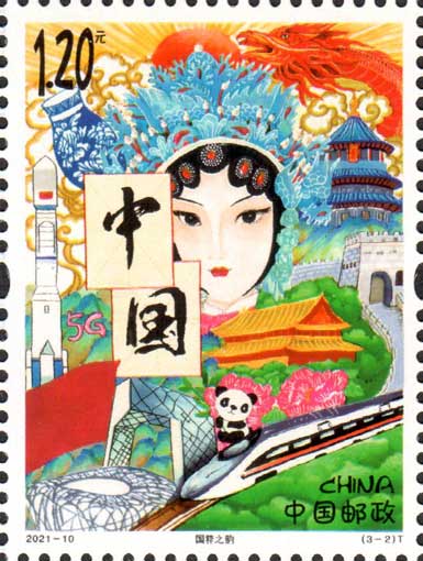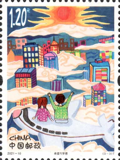 该套邮票的表现内容为:(1)我的中国梦;(2)国粹之韵;(3)希望与梦想。第一枚通过描绘我国航空航天事业、城市、交通网络繁荣发展等场景,表达了少年儿童不断追寻对宇宙探索的梦想以及对未来美好生活的想象与憧憬;第二枚描绘了传统文化与城市发展、现代科技共繁荣的场景,表达了新时代的少年儿童对中华优秀传统文化的追求和传承;第三枚描绘了伟大祖国不断发展的场景,少年儿童登高望远、憧憬未来。三枚邮票紧密围绕主题,展现出少年儿童对党的领导下伟大祖国的美好祝愿、热爱和自豪。
