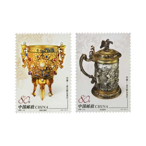 中国和波兰于1949年10月7日建立外交关系。近年来,在两国政府和人民的共同努力下,两国在经贸、文化等领域的交流与合作不断发展。为增进中波两国人民之间的相互了解和友谊,两国邮政主管部门决定联合发行《金银器》特种邮票一套2枚,一枚表现中国的金瓯永固杯,一枚表现波兰的巴洛克杯。2005年2月,两国邮政在北京签订了联合发行邮票协议,2006年1月双方在华沙选定了邮票图稿。这套邮票的发行正是两国邮政部门友好合作的结晶,是两国人民友谊的象征。