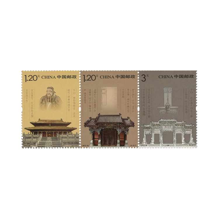 2010年9月28日是孔子诞辰2560周年,中国邮政于当日发行2010-22《孔庙、孔府、孔林》特种邮票一套三枚,面值依次为1.20元、1.20元和3元,同时还发行小全张一枚,售价为8.10元。这套邮票由著名邮票设计家郝旭东、陈景异联合设计,分别以孔庙大成殿、孔府重光门和孔林万古长春坊为主图,以孔子行教像、《论语》古籍和孔子墓前石碑为背景,并有论语中的精典语句隐印其中。