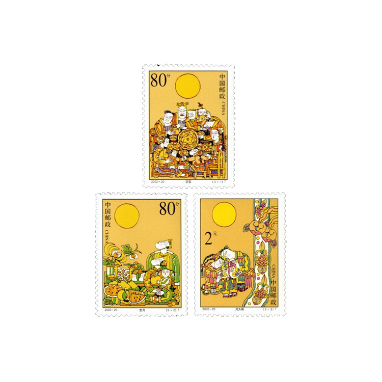 2002年9月21日,为了迎接我国民间隆重的传统节日“中秋节”的到来,国家邮政局发行了《中秋节》特种邮票,全套3枚,同时发行小版张1套1版。
