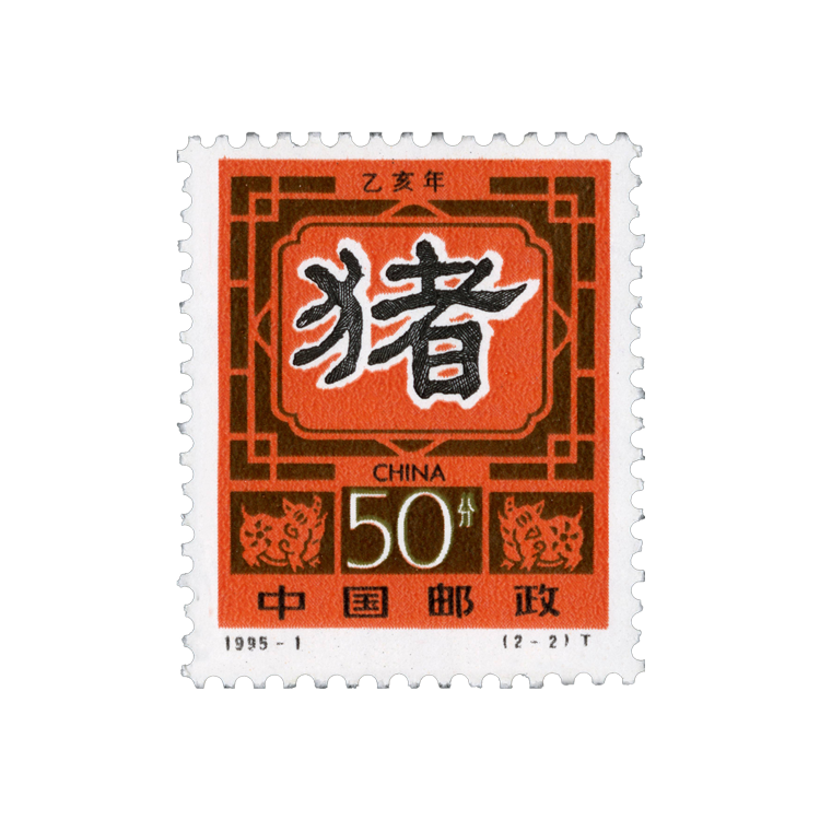 这套邮票是第二轮生肖邮票中的第四套,采用民间布玩具手法设计和隶书“猪”字。