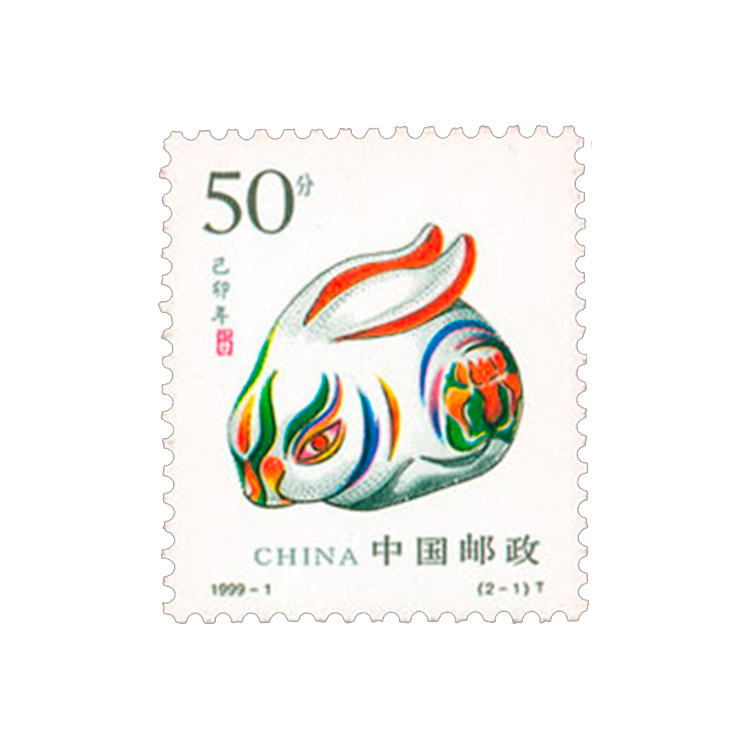 《己卯年》邮票全套2枚。第一枚邮票的图案采用了泥人张第四代传人,清华大学美术学院张锠教授捏的泥兔。这是一只以黑色为主的彩兔,它匍匐在地,双耳向后拢去,显得温顺而善良。但是,因为这枚生肖邮票图案适逢白底色,人们印象中的兔子多是白色的,民间传说又有“玉兔”之说,于是,设计者运用电脑技术对墨兔进行了“植皮手术”,由黑花兔至灰花兔再至白花兔,既给兔增添了一层“玉衡星散而为兔”的祥瑞色彩,又具有中国传统文化以兔为明月之精的吉祥、幸福的象征。画面左上角题有“己卯年”字样,铃有“己卯”红色印章,巧妙地点明了主题。 第二枚邮票图案以选自《五体字典》中的一个草书“兔”字为主图,字形灵秀,特别是倒数第2笔的那一钩,颇富动感,和第1枚图案中的彩兔形态相匹配,能够让人品出“静若处子,动若脱兔”的意味。衬底采用清代山西“月亮图”剪纸,恰好解释了第1枚图案“玉兔为月”之名。整个图案采用红色铺底,既达到了红黄相衬的和谐效果,又透着一种迎春的喜庆气氛。