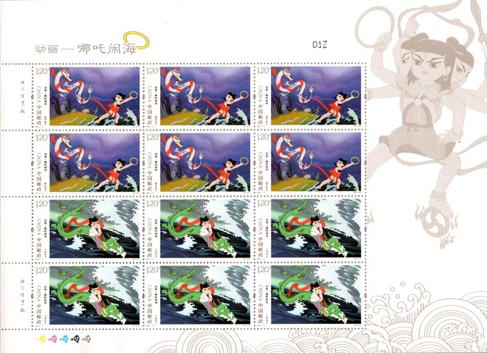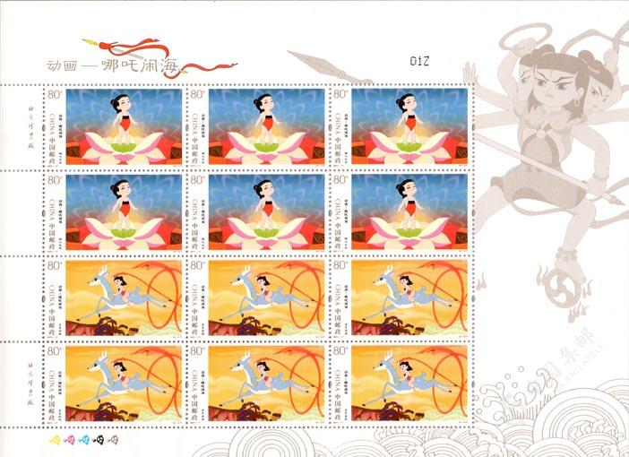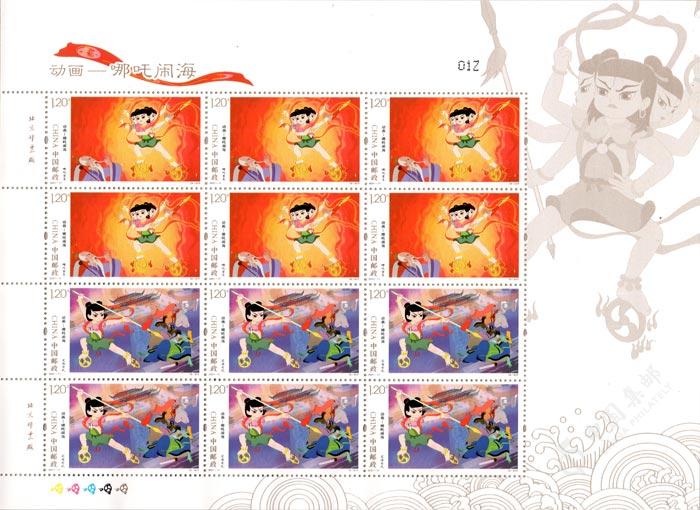 《动画——哪吒闹海》邮票表现了动画中哪吒出世、童年游趣、擒拿敖丙、斗战龙王、哪吒重生、定海安民6个故事情节,画面不仅呈现了哪吒天真、可爱的性格,还表现了他不畏权威、争取正义的可贵精神。6枚邮票分别采用6种色调,色彩特征鲜明、连贯,展现了不同动态的人物形象。整体设计借鉴电影中蒙太奇的表现手法,将不同时间、场景、镜头画面重构,在静止的邮票中呈现出栩栩如生的动画情节,还原了很多人心中的一段童年记忆。