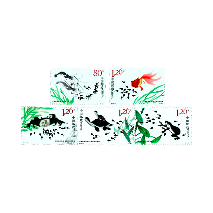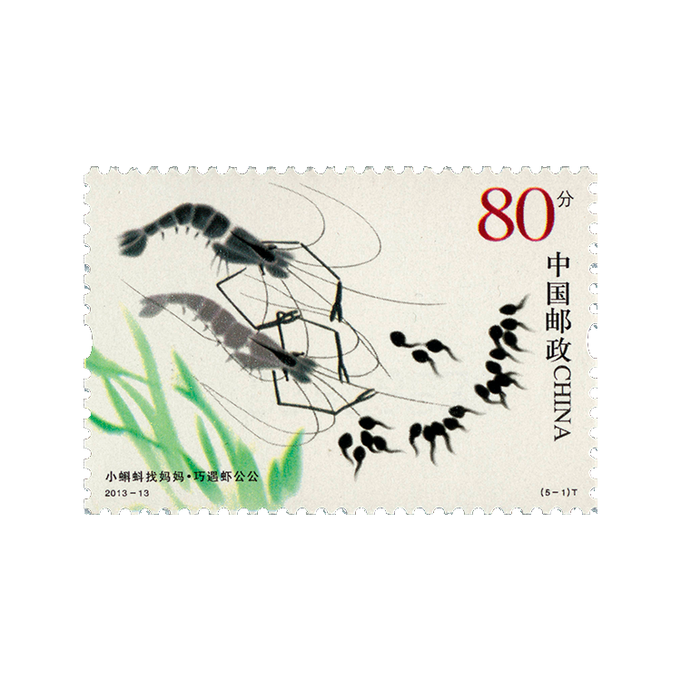 小蝌蚪找妈妈,童话故事,原作者方惠珍、盛璐德。通过小蝌蚪寻找青蛙妈妈的过程,寓教于乐地讲述了蝌蚪生长发育的科学规律。故事于1960年由上海美术电影制片厂改编为中国第一部彩色水墨动画片。影片中蝌蚪、青蛙、虾、蟹等原型取自于齐白石的画作。邮票表现了小蝌蚪向虾公公打听,错认了金鱼、螃蟹、乌龟为妈妈,最后终于找到青蛙妈妈这五个生动画面,不失童趣和雅致,再现了原作中国传统水墨画的艺术风格。