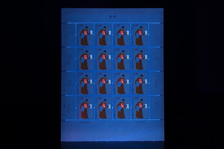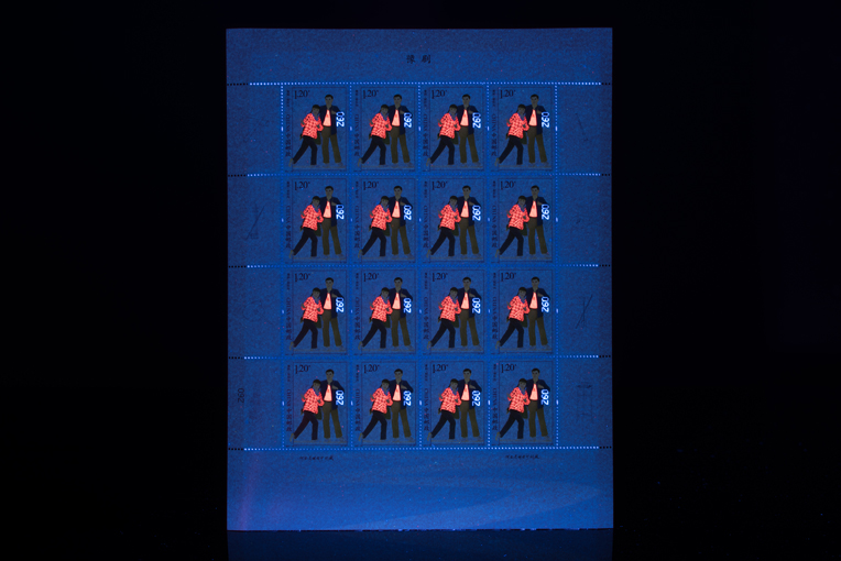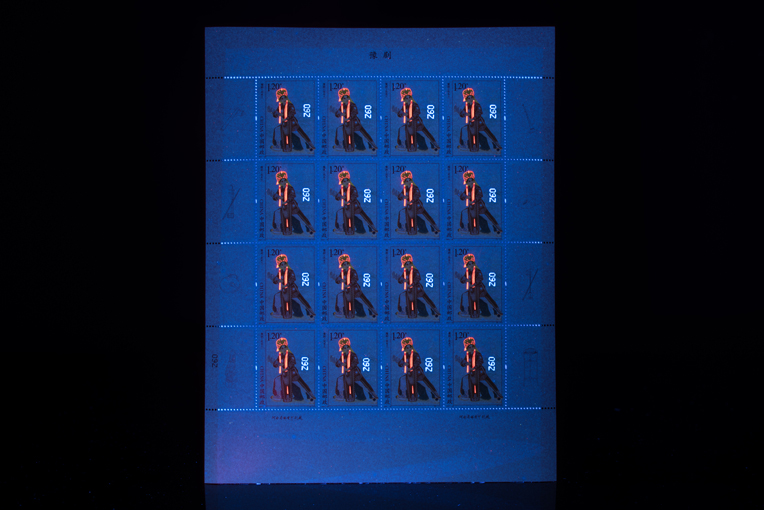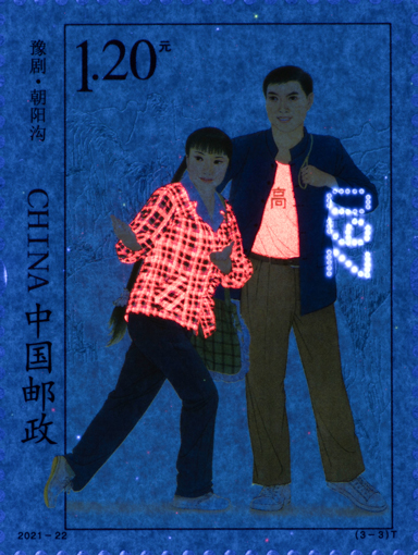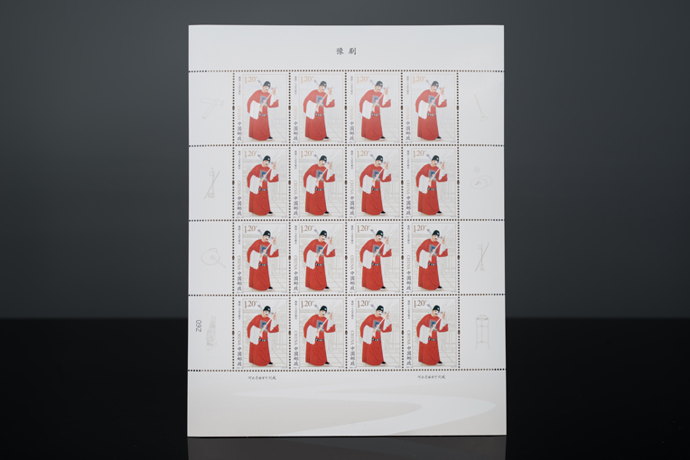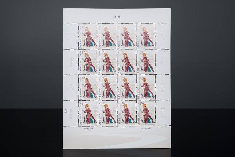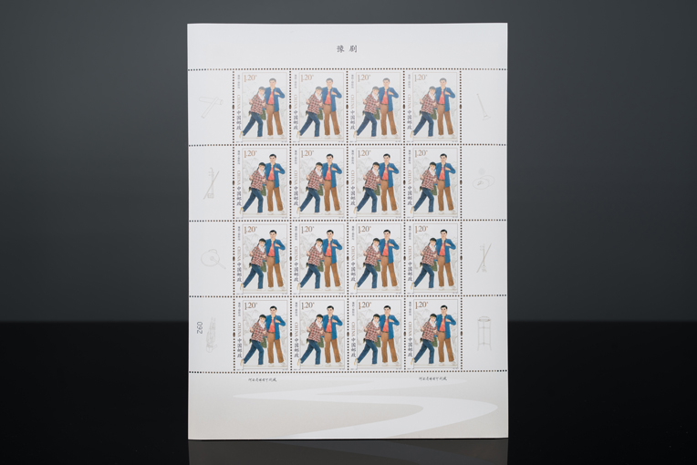 该套邮票由河南省邮电科技有限公司胶印工艺印制。在印制上,精心刻画人物细节。通过珠光油墨将服饰上的珍珠、配饰等做了色泽度的提亮,凸显戏剧服饰的华美。通过特种油墨精心的层次处理调整服饰、背景等元素的明暗关系,增强配饰立体感,真实还原戏曲年代特点。邮票背景应用特种材料,在不同光线下展现特殊效果。一图花木兰采用棕色变金色,契合木兰辞中诗句“旦辞爷娘去,暮宿黄河边”的意境。二图七品芝麻官采用棕色变蓝紫色,蓝紫色是清正廉洁的象征,变色工艺设置与人物特呼应。三图朝阳沟使用棕色变绿色,将两个年轻人建设新农村的故事与新时代总书记提出“绿水青山就是金山银山”的生态理念联系起来。版张边饰上黄河采用特殊油墨印制,在阳光下呈现波光粼粼的景象。