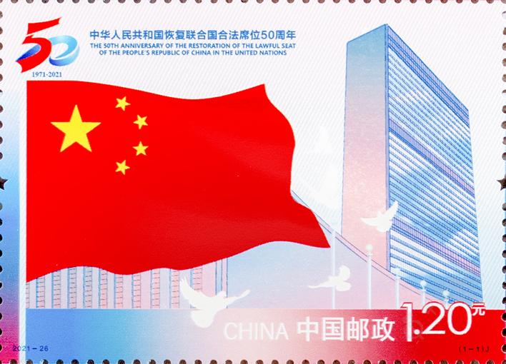 中国邮政定于2021年10月25日发行《中华人民共和国恢复联合国合法席位50周年》纪念邮票1套1枚。
