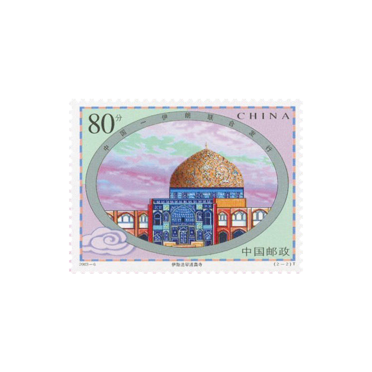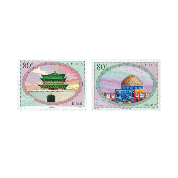 伊朗伊斯兰共和国是一个多民族的伊斯兰国家,位于亚洲西南部,同土库曼斯坦、阿塞拜疆、亚美尼亚、土耳其、伊拉克、巴基斯坦和阿富汗相邻。伊朗是具有四、五千年历史的文明古国,史称波斯。中伊作为两个文明古国,两国人民之间的交往和友谊源远流长,在“丝绸之路”的繁荣达到顶峰时期,伊朗的商队来到中国,不仅带来了伊朗的特产和文化,也增进了两国之间的了解和联系。1971年8月16日两国建交。1989年5月6日,位于“丝绸之路”上的中国古都西安与伊朗历史名城伊斯法罕结为友好城市。联合发行的邮票便选取了两个城市的典型建筑为主图。通过两国具有代表性的建筑来体现文化的交流与友谊的延续。