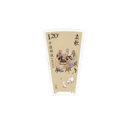 立秋是二十四节气中的第13个节气。立秋民间素有“贴秋膘”的习俗,方式多以吃味厚的美食佳肴来补身。邮票表现了一家人围坐“贴秋膘”的温馨场景。