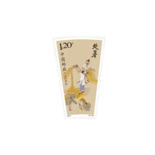 处暑是二十四节气中的第14个节气。从处暑开始,昼暖夜凉的条件有利于农作物的生长,部分地区的农作物已开始收获。邮票描绘了农民晾晒农作物的丰收场景。