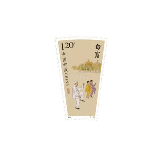 白露是二十四节气中的第15个节气。白露时节由于昼夜温差达到全年最大,宜进行适当的锻炼以强身健体。邮票表现了老人和孩子打拳健身的运动场景。