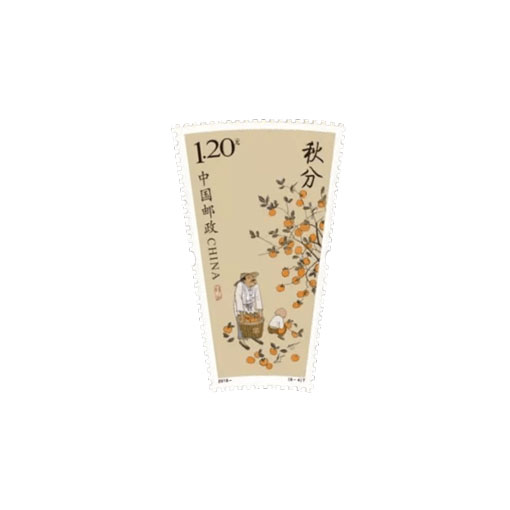 秋分是二十四节气中的第16个节气。秋分后是每年秋季农事活动最为繁忙的时期,此时部分地区的柿子已经成熟。邮票描绘了老人带领孩童采收柿子的场景,寓意事事平安。