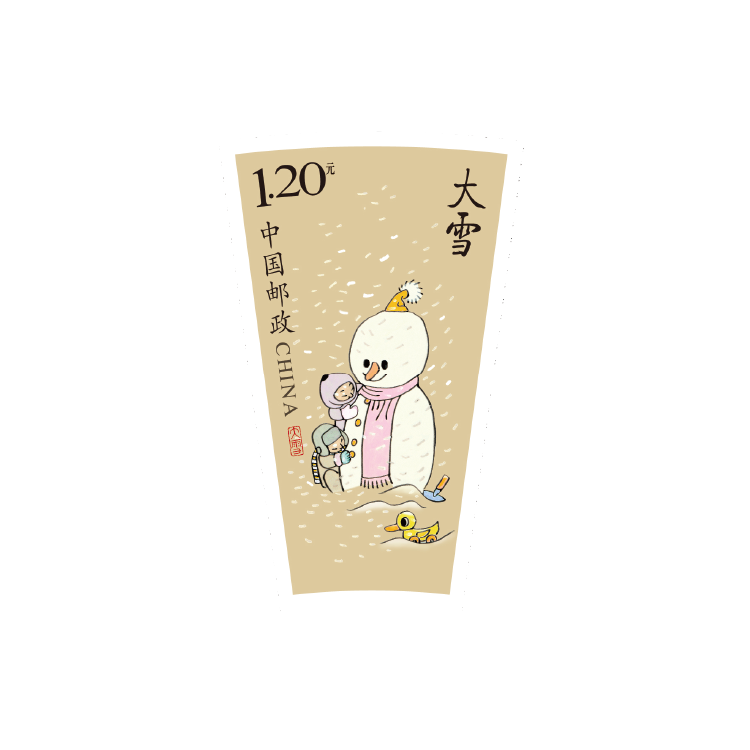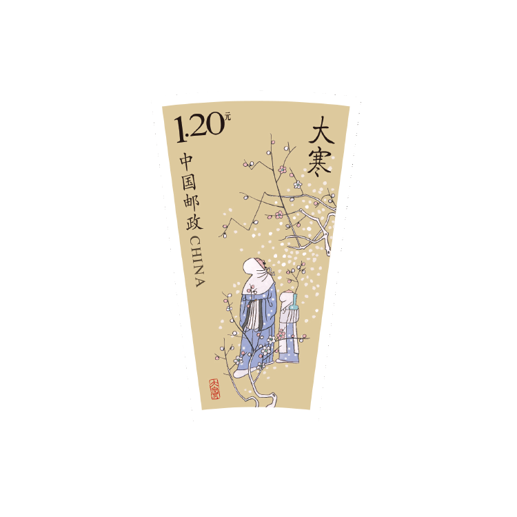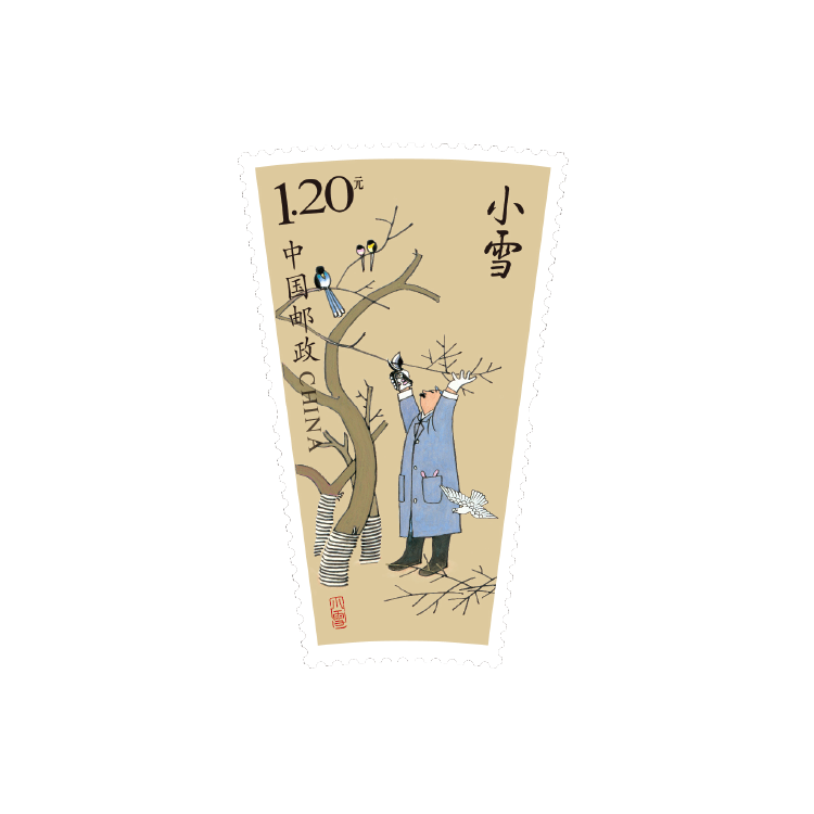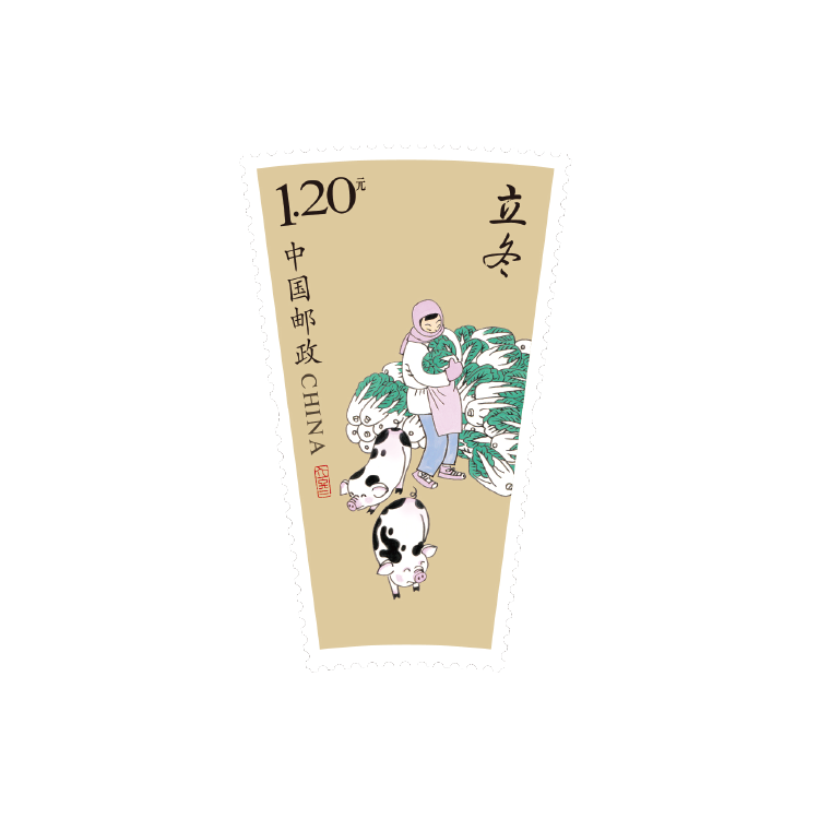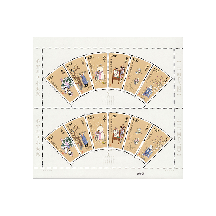 二十四节气是我国古代根据一年中太阳在天球黄道位置划分出来的24个具有时节意义的位置与日期,每个节气约15天,是中国人认知天象、物候、时令和大自然变化规律的知识体系与社会实践,是中华民族传统文化的重要组成部分。2016年,二十四节气被列入联合国教科文组织人类非物质文化遗产代表作名录。本套邮票为自2015年开始发行的《二十四节气》系列邮票第四组,表现冬天的六个节气。经过了春天的草长莺飞、桃红柳绿,夏天的阳光灿烂、浓荫匝地,秋天的金风送爽、硕果累累,便迎来了飞雪凝霜、寒风刺骨的冬天。这六个节气分别是:立冬、小雪、大雪、冬至、小寒、大寒。