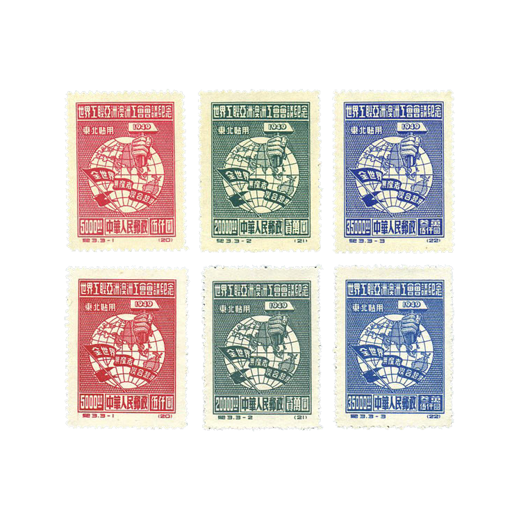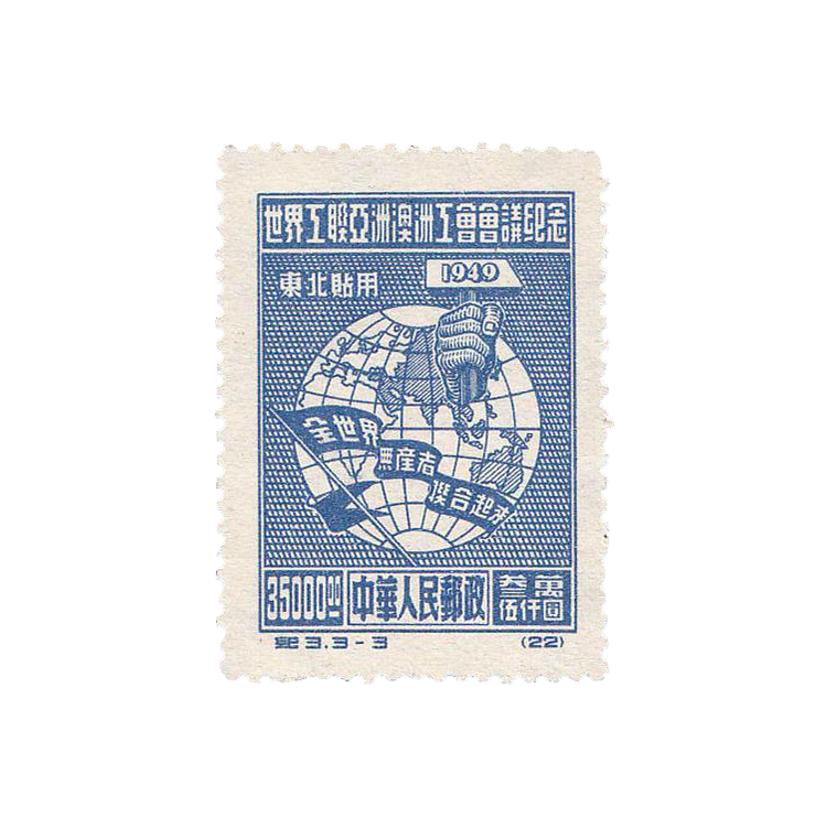 1949年11月16日,为祝贺这次会议在刚刚诞生的新中国召开,华北邮政总局发行了《世界工联亚洲澳洲工会会议纪念》东北贴用纪念邮票,全套3枚。为适应集邮事业的发展需要,邮电部1955年1月10日发行再版票。邮票图案相同,均为宇宙间一颗硕大的地球,上绘亚洲、澳洲的版图,其中一只紧握上书“1949”字样铁锤的大手,从中国首都北京的位置上伸出,象征着工人阶级为改善生活和劳动条件而奋斗。下部分为一面写着“全世界无产者联合起来”的旗帜形彩带。
