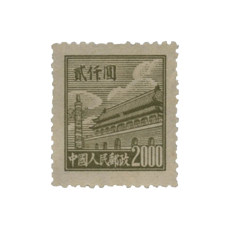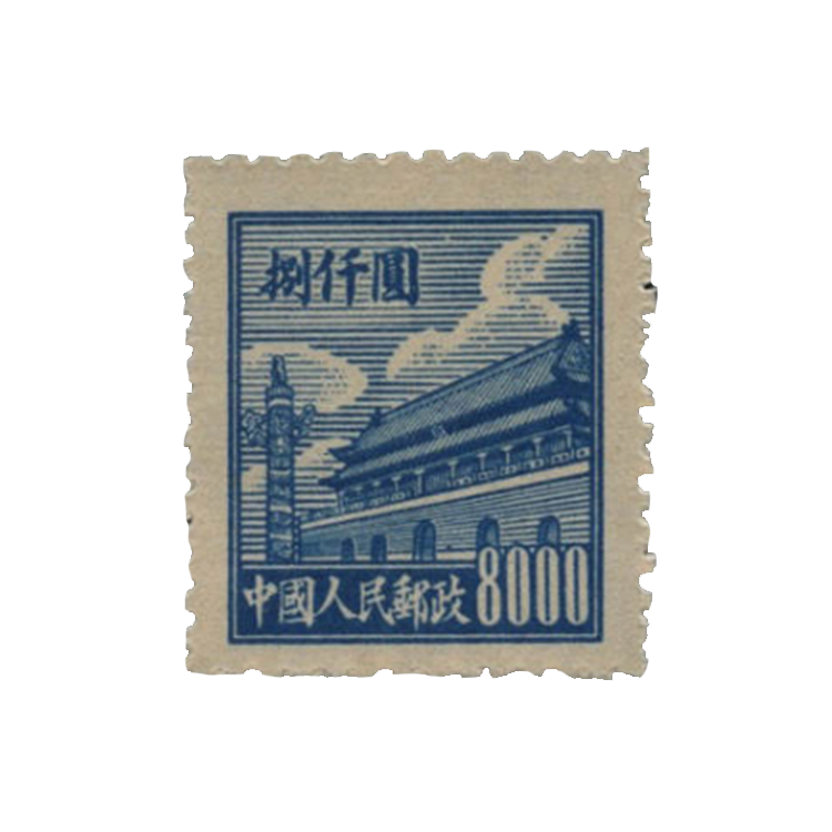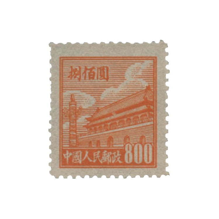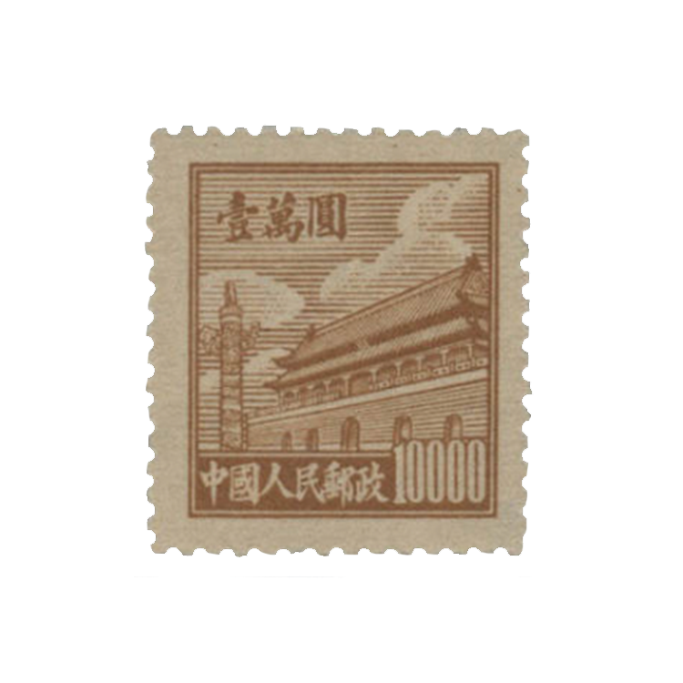 1950年1月1日,邮电部邮政总局成立,除东北地区外,全国不仅统一国内邮资,而且有了全国统一的邮政机构。1950年1月9日,邮政总局颁发国际邮件资费表。1月14日邮政总局发出通令,规定邮票由邮政总局统一印发,过去各解放区自印的各种邮票一律停止印刷,以印成或加字改值的邮票,售至同年3月底,已售出的邮票用至5月底为止。为适应邮政业务的发展需要,中国人民邮政发行了第一套普通邮票,编号普1,全套9枚。邮票采用胶版印刷,胶版的特点是图案花纹和空白部分相平,图案上边两条边线下的第一条横线与右边边框不连接,华表石中部的右边五条横线与柱身相连,图案左右两边的内边框线是由上至下与下框相连。天安门上空白云为三朵,天安门城墙上没有悬挂毛泽东画像。