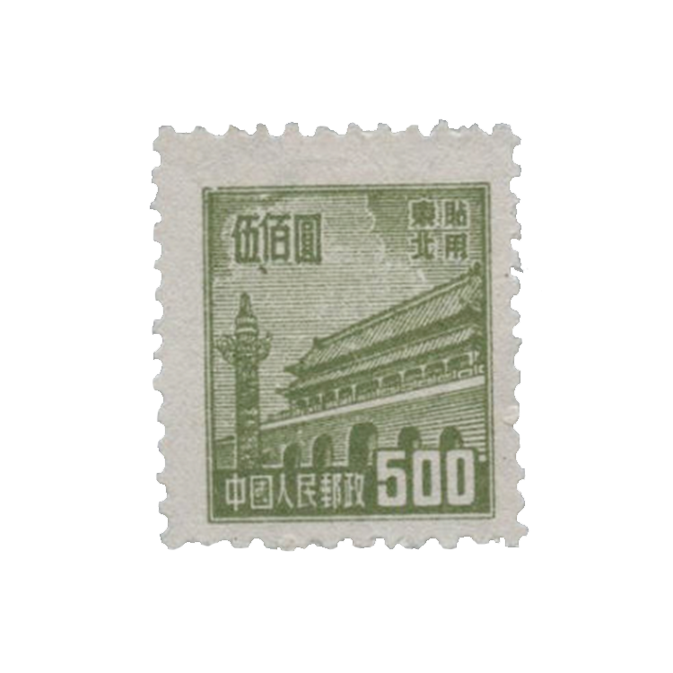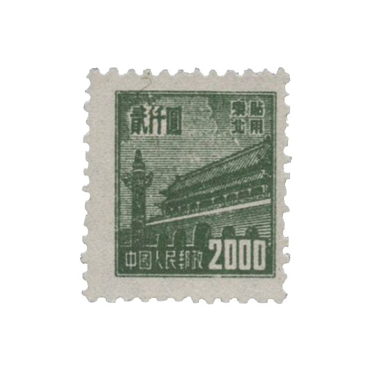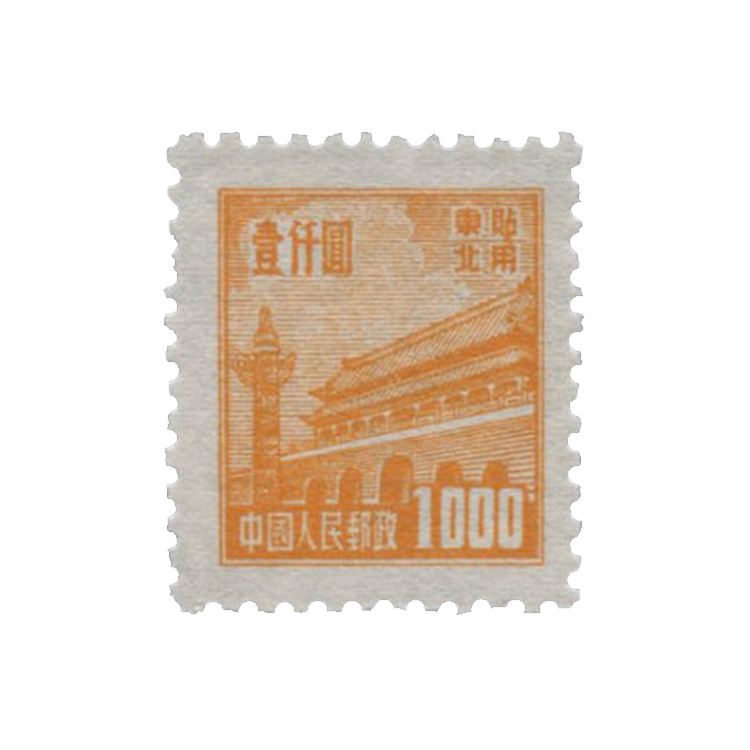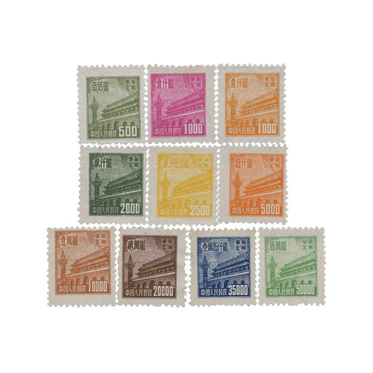 邮电部东北邮电管理总局1950年1月25日发行(其中粉红色1000圆面值邮票发行时间为1950年8月1日),1套10枚。