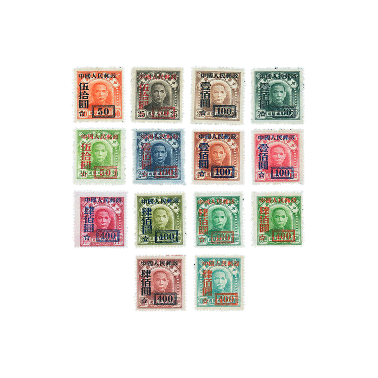 1950年6月9日,邮电部发行了“中华邮政(中央版)‘限东北贴用’邮票”加字改值,1套14枚。第二枚至第四枚于1950年6月9日发行,第五枚至第十四枚于1950年7月6日发行。