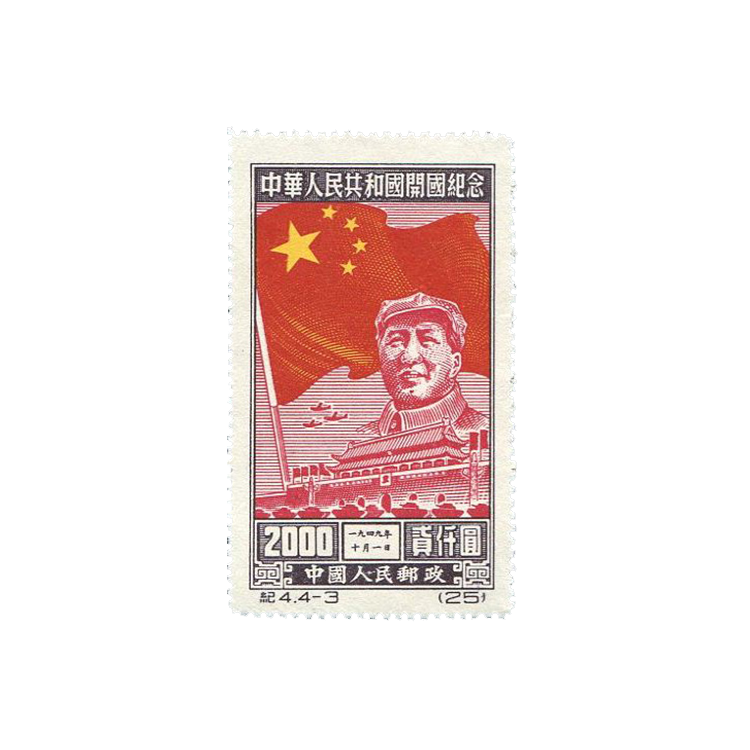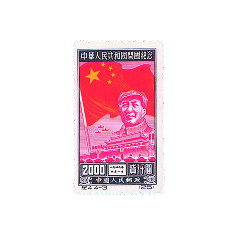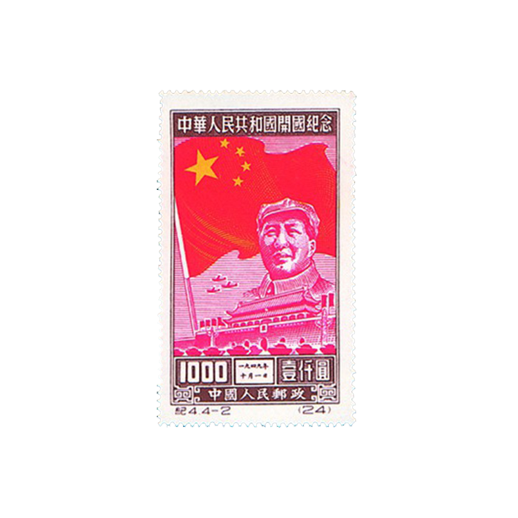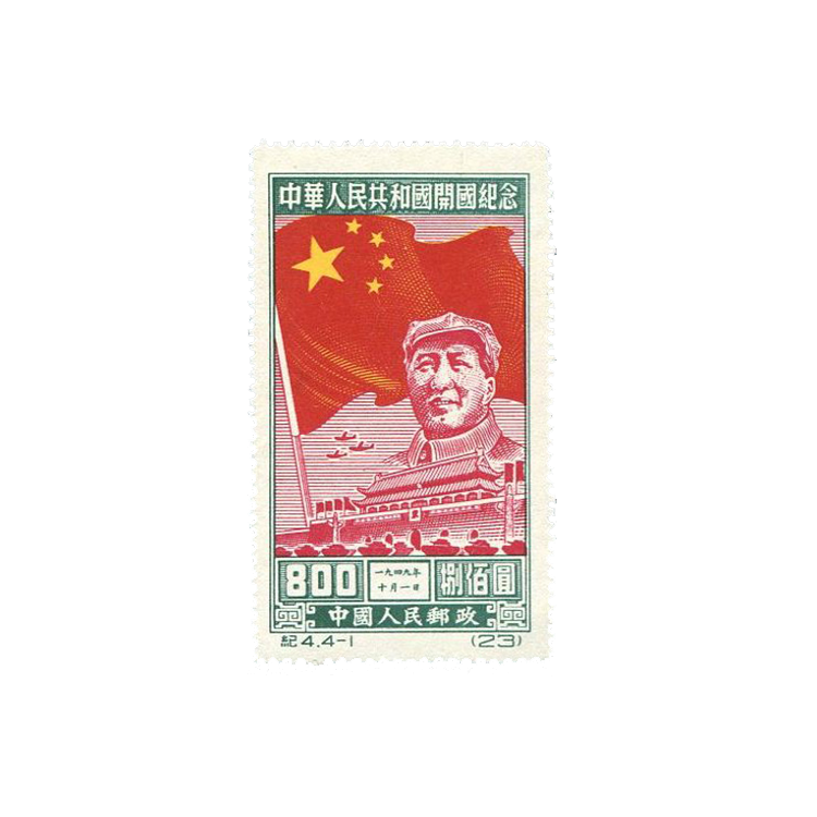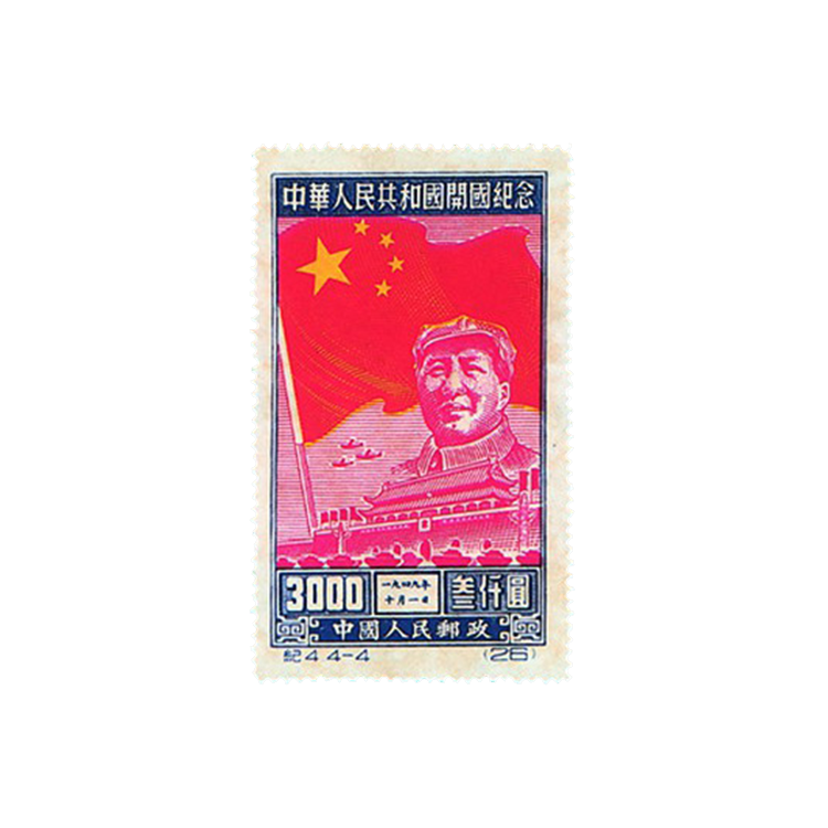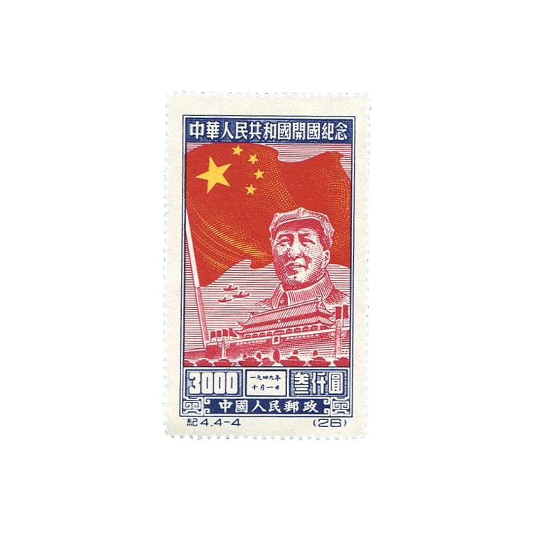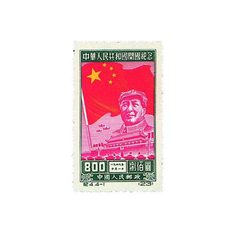 1949年10月1日15时,在天安门广场举行开国大典,庆祝中华人民共和国中央人民政府成立。为纪念这一历史事件,自1949年北平解放之后,便积极着手筹备人民政协第一届全体会议和中华人民共和国成立两套纪念邮票的发行工作。但因后来对图稿多次修改,如票型由横版改为竖版;“中华人民邮政”改为“中国人民邮政”;由于邮资的调整,使这套邮票从选题、设计、印制直到发行,将近1年,迟至1950年建党纪念日才问世。全套4枚邮票,图案相同。庄严的五星红旗第一次在中国邮票上出现。毛泽东主席,宏伟的天安门以及接受检阅的人民解放军的坦克、飞机,都形象地记录了新中国开国盛典的这一伟大的历史时刻。亦发行了东北贴用套票,并于1955年1月10日再版。这套邮票被评为建国30年最佳邮票之一。