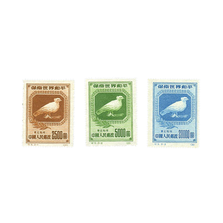 1950年8月1日,邮电部为了表达中国人民热爱和平的心愿发行了此套邮票,1套3枚。1955年1月10日发行再版票,1套3枚。