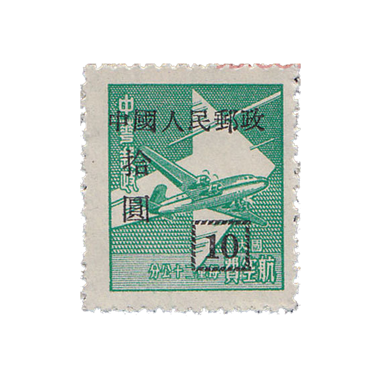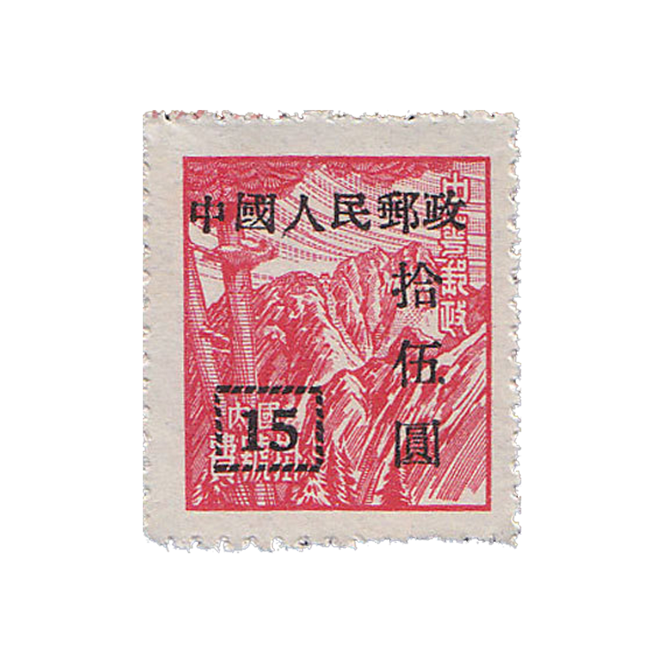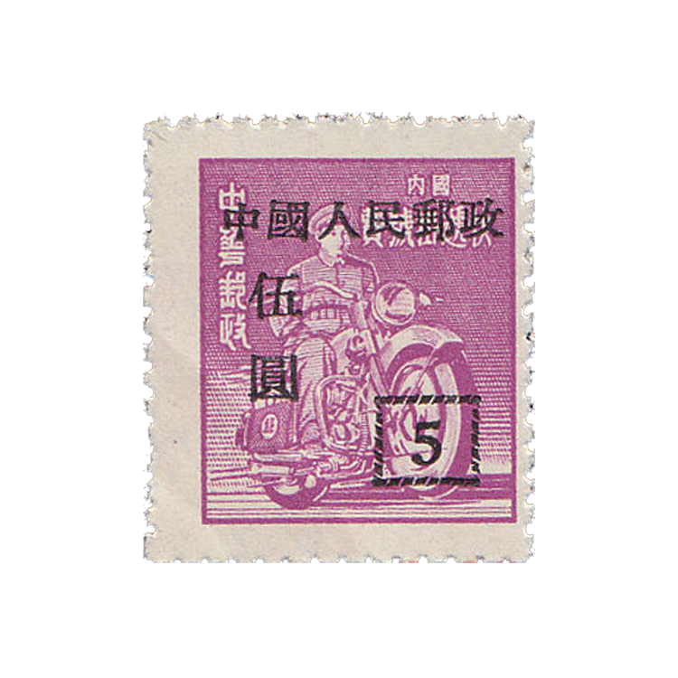 1950年5月发行的“改1”以中华邮政时期无面值的单位邮票为原票,加字改值,共有6种面值。原票虽然只有4种图样,但曾由上海大东书局和香港亚洲石印局两家印刷,前者为圆孔齿,后者为虚线齿,其中“快递挂号”改100元一种,以亚洲版票加盖的,未经大量出售,这套邮票已宣告停用了。