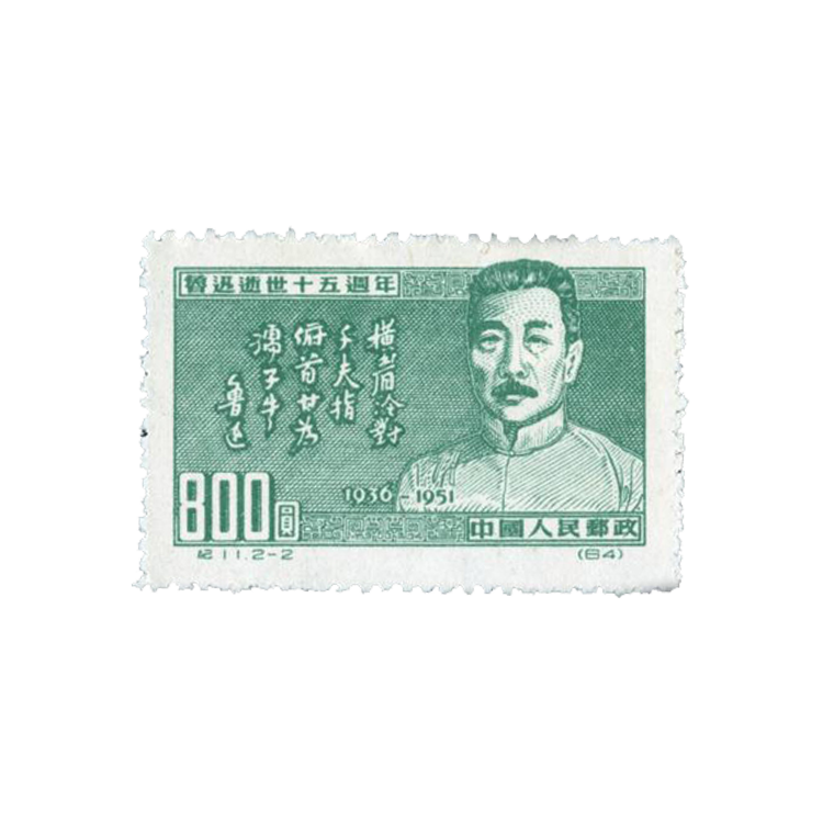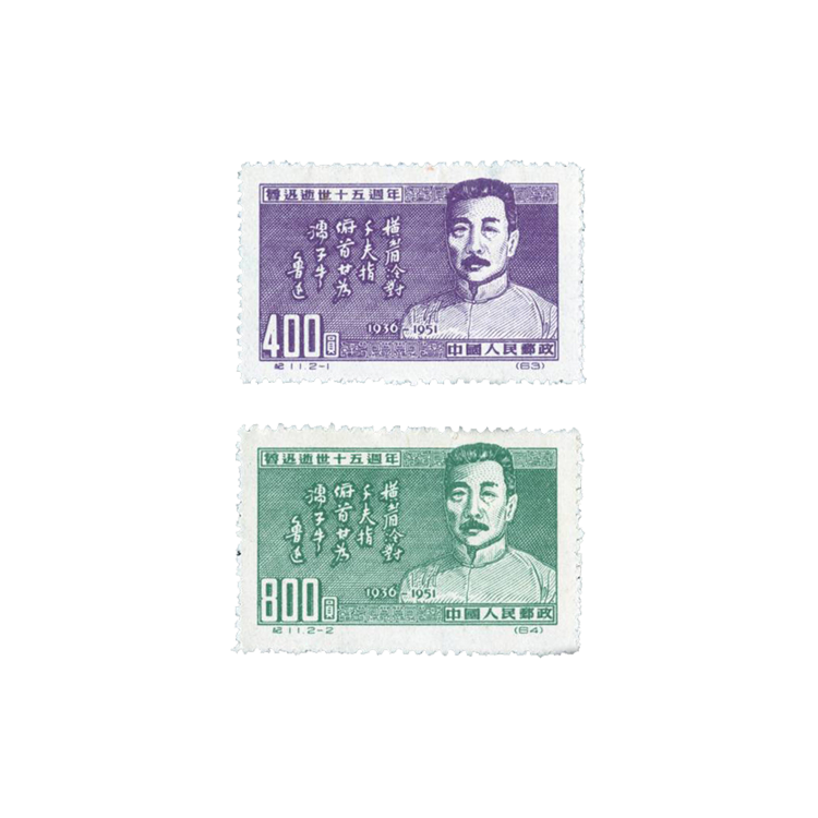 1936年10月19日,鲁迅因肺病,在上海与世长辞,享年56岁。巨星陨落一十五载。为了纪念他,邮电部发行了这套《鲁迅逝世十五周年》纪念邮票。全套2枚,画面相同,均为鲁迅半身画像及诗句:“横眉冷对千夫指,俯首甘为孺子牛。”这两句话,源自1932年10月12日鲁迅写给著名爱国人士柳亚子先生的一首小诗,题为《自嘲》,全文:“运交华盖欲何求,未敢翻身已碰头。破帽遮颜过闹市,漏船载酒泛中流。横眉冷对千夫指,俯首甘为孺子牛。躲进小楼成一统,管他冬夏与春秋。”这首诗写在中国最为黑暗的年代,面对外部日本帝国主义的疯狂侵略和内部国民党反动派残酷压迫及文化“围剿”,鲁迅以幽然的笔调和自嘲的口吻,描述了自己深受迫害的险恶处境,抒发了顽强的斗志和乐观的豪情。这套邮票于1955年1月10日再版。