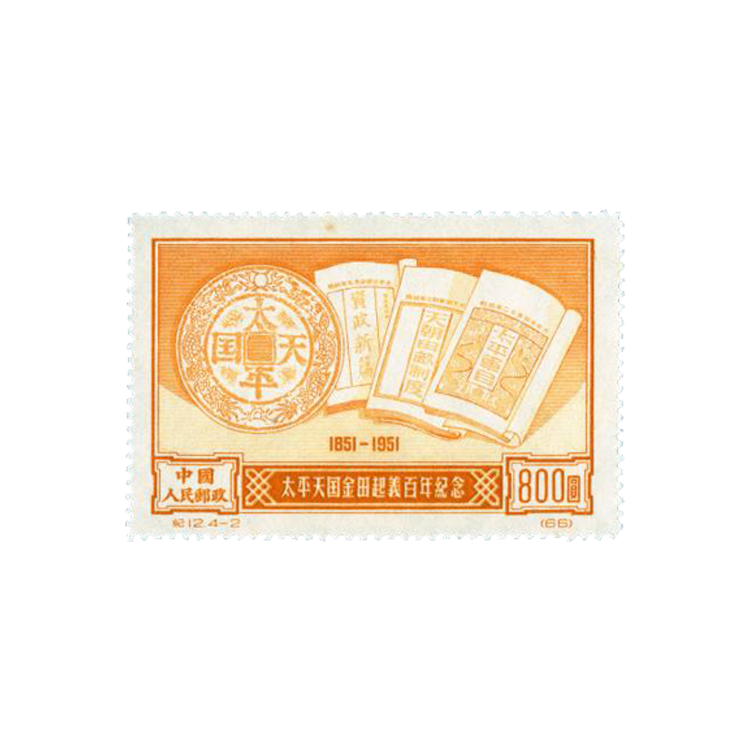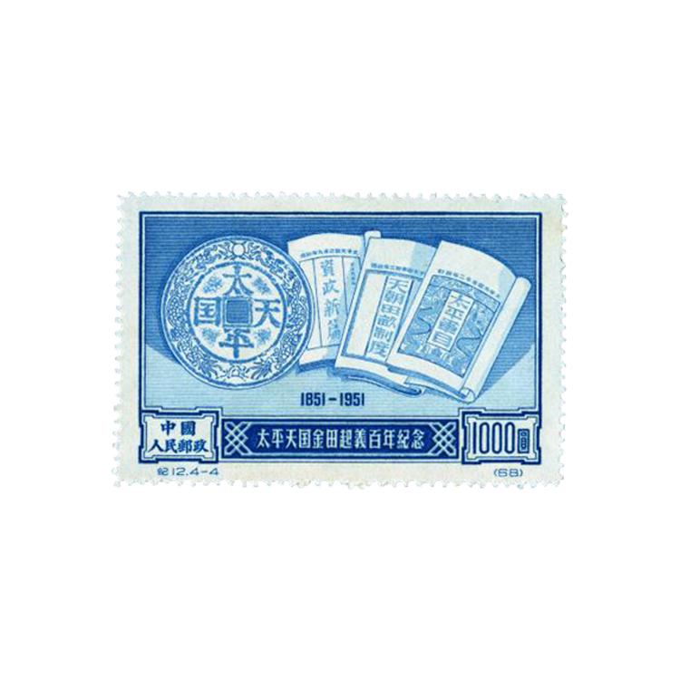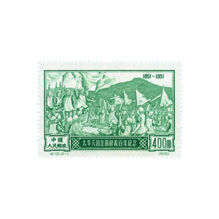 本套邮票共4枚。(4-1)(4-3)画面为“金田起义”,主图是挥动旗帜,手执长矛、大刀的起义农民,背景是紫荆山。右上角是“1851-1951”字样,下端是“太平天国金田起义百年纪念”和“中国人民邮政”字样及面值。画面真实地反映了金田起义的情景。邮票刷色分别为草绿和红色。(4-2)(4-4)画面为“太平天国文献和钱币”,主图为《天朝田亩制度》《资政新编》《太平军目》等太平天国文献和太平天国钱币“圣宝”。邮票刷色分别为桔黄和蓝色。