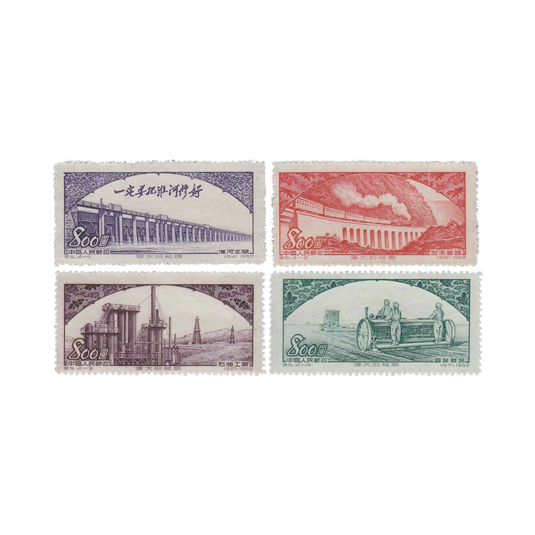 为了反映国家的建设成就,值国庆3周年之际,邮电部发行了这套《建设》特种邮票。共4枚,是《伟大的祖国》系列邮票的第二组邮票。邮票画面介绍了我国解放初期治理淮河、建设成渝铁路、建成玉门炼油厂和组建国营农场等方面的社会主义建设成就。
