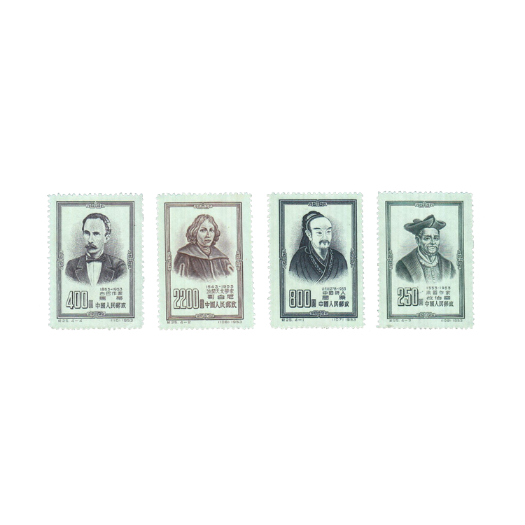 1953年,世界和平理事会提出了纪念世界四大文化名人,所发行的邮票,1套4枚。