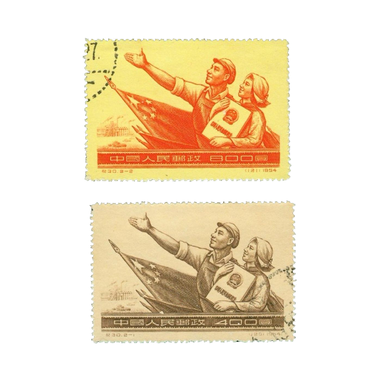 我国邮电部发行“中华人民共和国宪法”纪念邮票,编号纪30,全套2枚,图案相同,均为工人、农民怀抱《中华人民共和国宪法》,在红旗漫无边际卷中,展望社会主义建设的灿烂前景的场面。表现了全国人民在宪法的指引下,乘胜前进的姿态和信心。