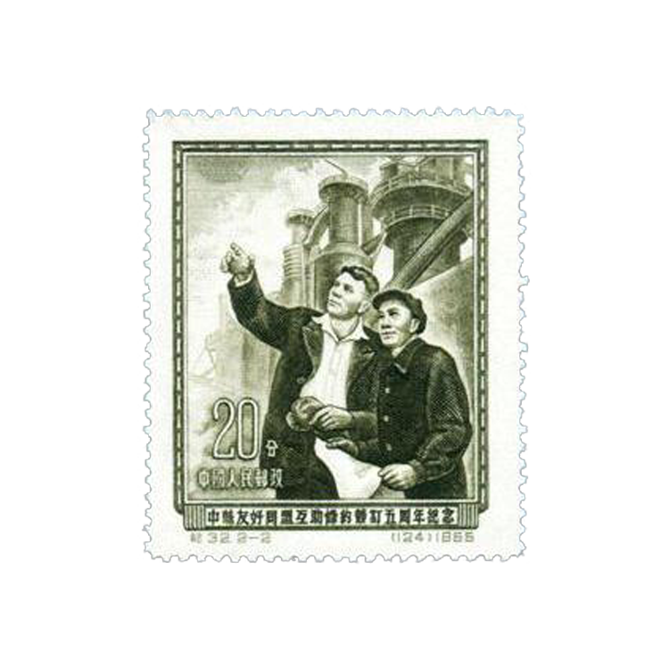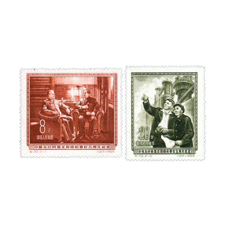 邮电部为了纪念中苏友好关系,1955年7月25日发行《中苏友好同盟互助条约签订五周年纪念》邮票,1套2枚