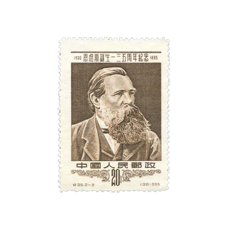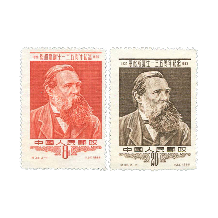 邮电部为纪念无产阶级革命导师恩格斯诞生135周年,1955年12月15日发行了这套纪念邮票。1套2枚