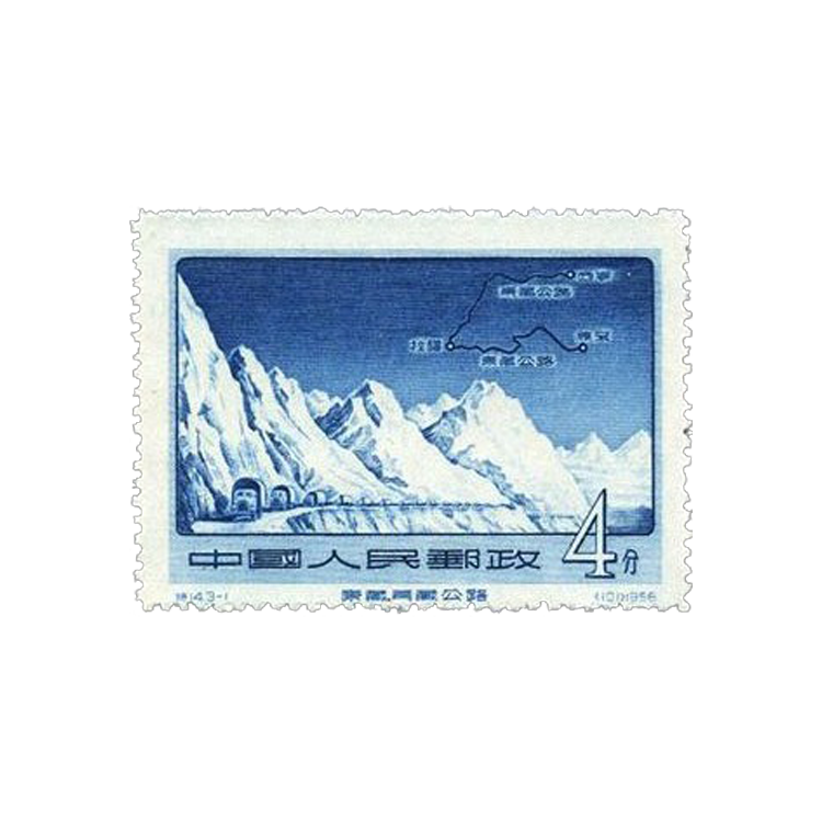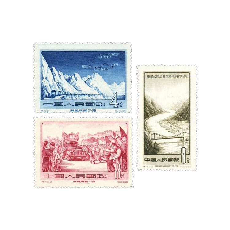 1956年3月30日,为了反映西藏公路建设的新面貌,中华人民共和国邮电部发行一套《康藏、青藏公路》特种邮票,全套3枚。卢天骄设计。雕刻版。宋广增、高振宇、孔绍惠雕刻。齿孔14度。无背胶。邮局全张枚数(1)(3)为80(8×10),(2)为91(13×7)。北京人民印刷厂印制。