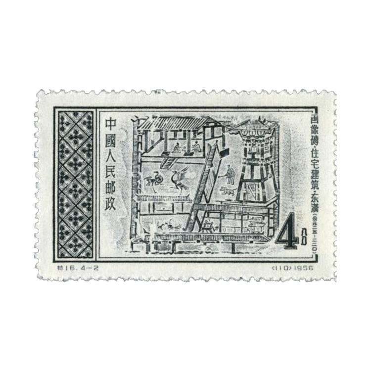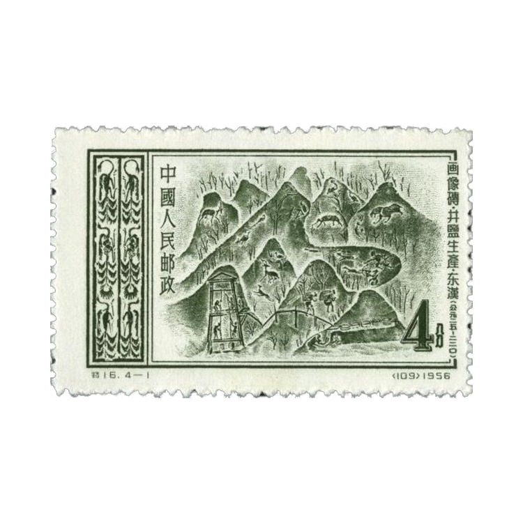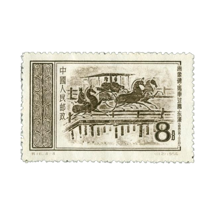 1956年10月1日,为了反映中华民族悠久灿烂的文化艺术,中华人民共和国邮电部发行一套《东汉画像砖》特种邮票,全套4枚。孙传哲设计。雕刻版。孔绍惠雕刻。齿孔14度。邮局全张枚数96(8×12)。北京人民印刷厂营业分厂印制。