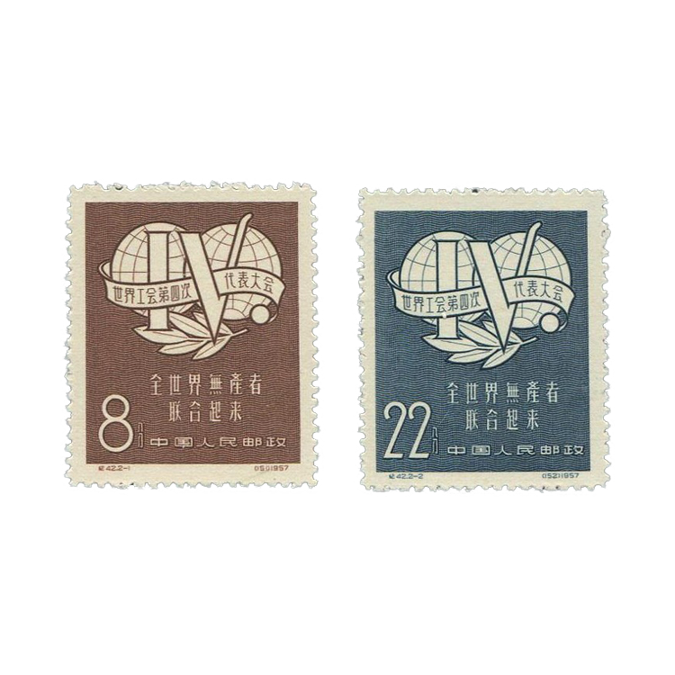为了祝贺这次大会的召开,在会议开幕前夕,邮电部发行了这套纪念邮票。2幅画面图案相同,均为这次大会的会徽和“全世界无产者联合起来”的文字组成,会徽由一枚硕大的橄榄枝叶烘托着东西两个半球,罗马数字“Ⅳ”贯穿中间,表达了世界工联第四次代表大会团结联合无产阶级,争取世界和平的主题。