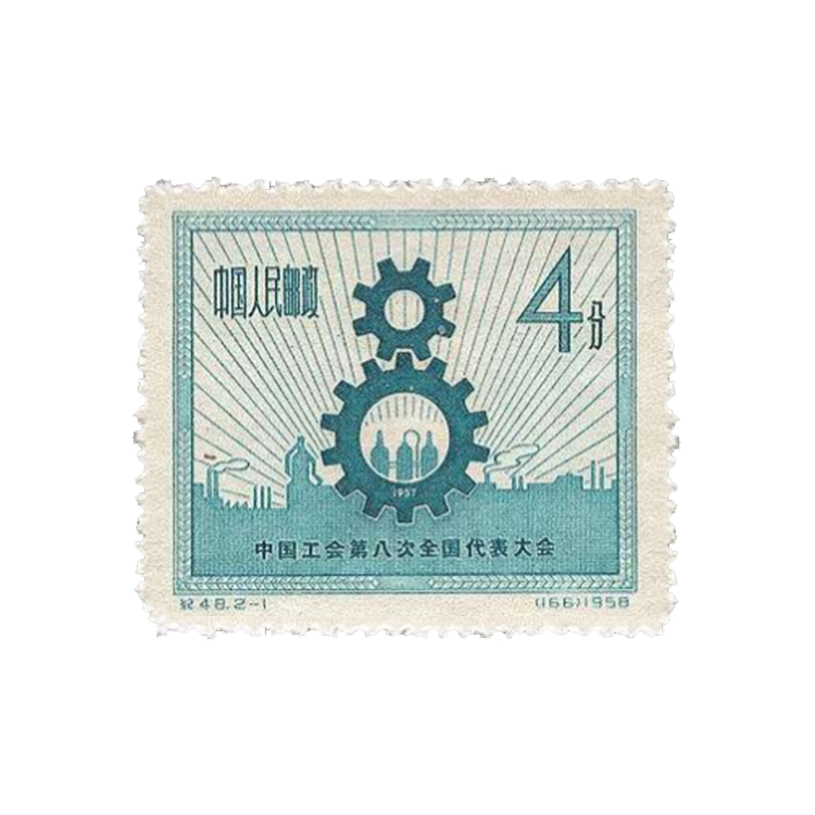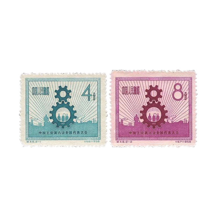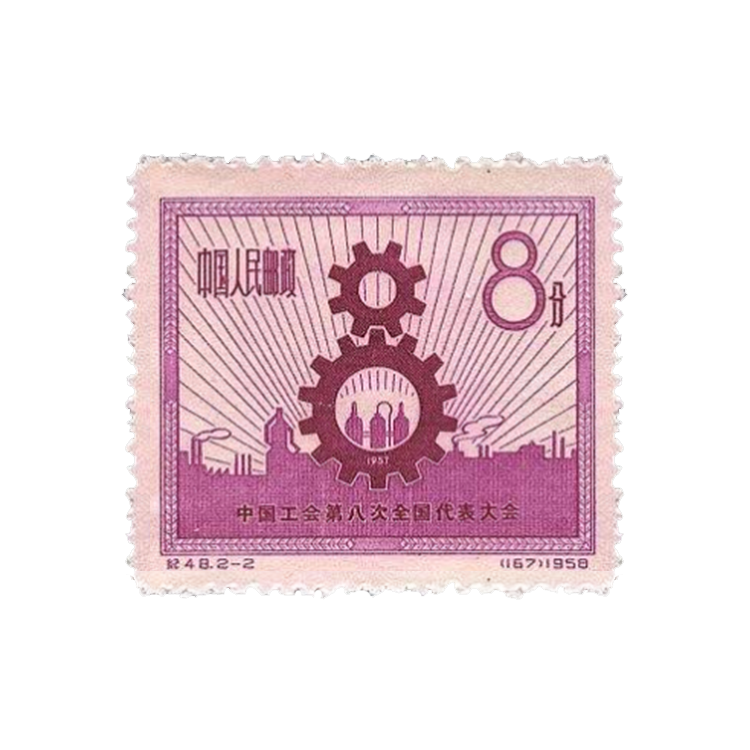 • 1958年5月25日,为祝贺中国工会第八次全国代表大会的召开,邮电部发行了 此纪念邮票,1套2枚。
