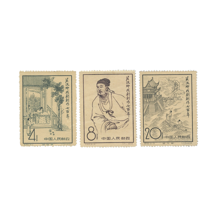 1958年6月20日,为了纪念关汉卿戏剧创作七百年,邮电部发行《关汉卿戏剧创作七百年》纪念邮票,全套 3枚。