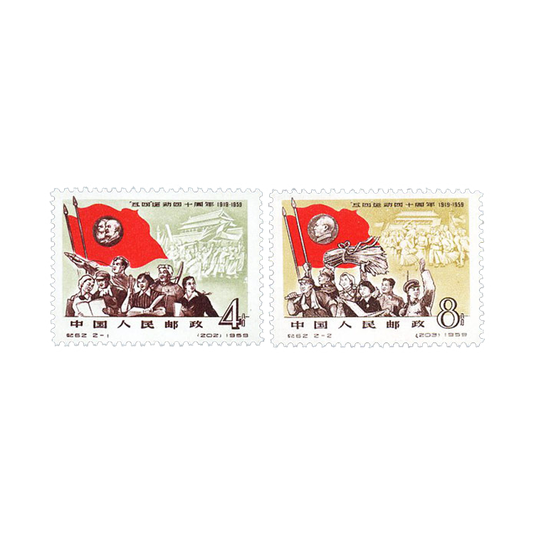 1959年7月1日,为纪念“五四”运动四十周年发行该套邮票,全套共2枚。值此伟大的“五四”运动40周年之际,国家邮电部发行了这套“五四”运动四十周年纪念邮票。主图分别为高举马列主义旗帜“向科学技术进军”的人们和高举毛泽东思想旗帜的“工、农、商、学、兵”各界群众背景为天安门及“五四”运动浮雕,表现在马列主义的旗帜下,工农商学兵发扬五四精神,继承五四传统,胜利前进的姿态。