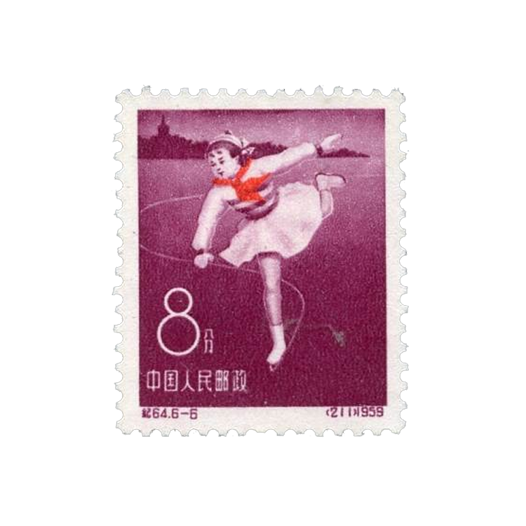 (211)为“体育运动”。画面为红色。一名女少先队员正在溜冰,她体态优美,动作娴熟,脸上挂着幸福的微笑。