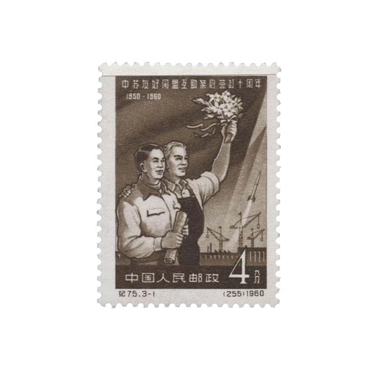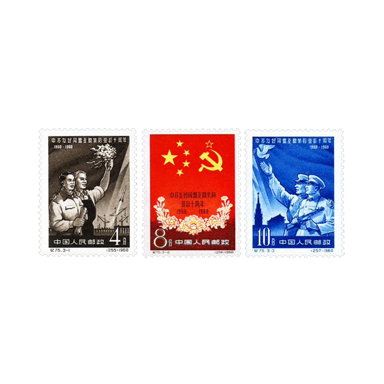 1960年3月10日,“中苏友好同盟互助条约”签订十周年之际,邮电部发行了该套纪念邮票,1套3枚。