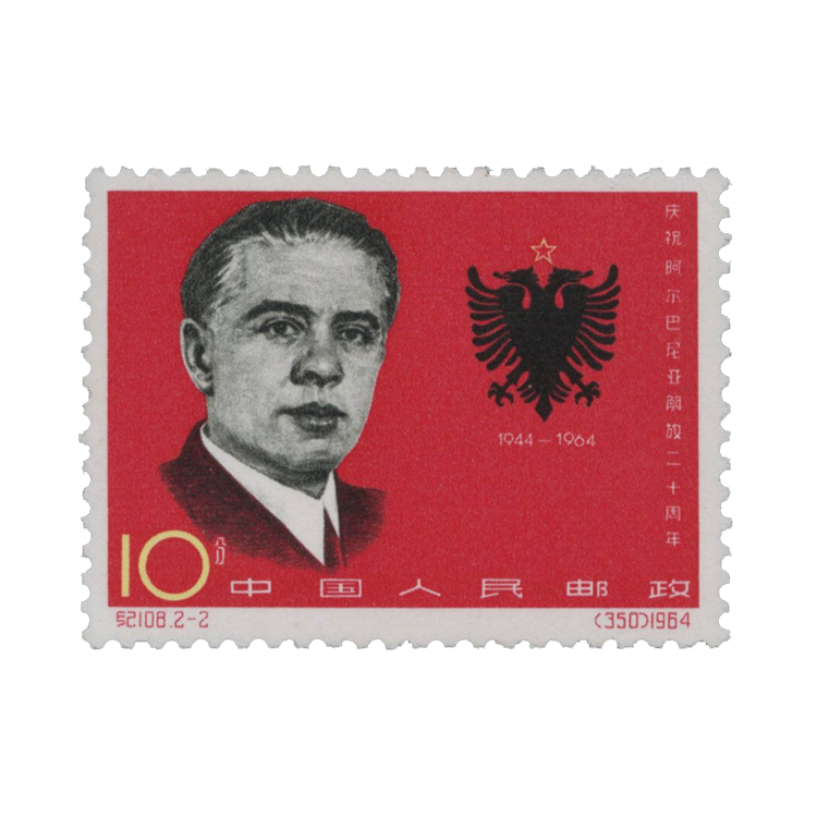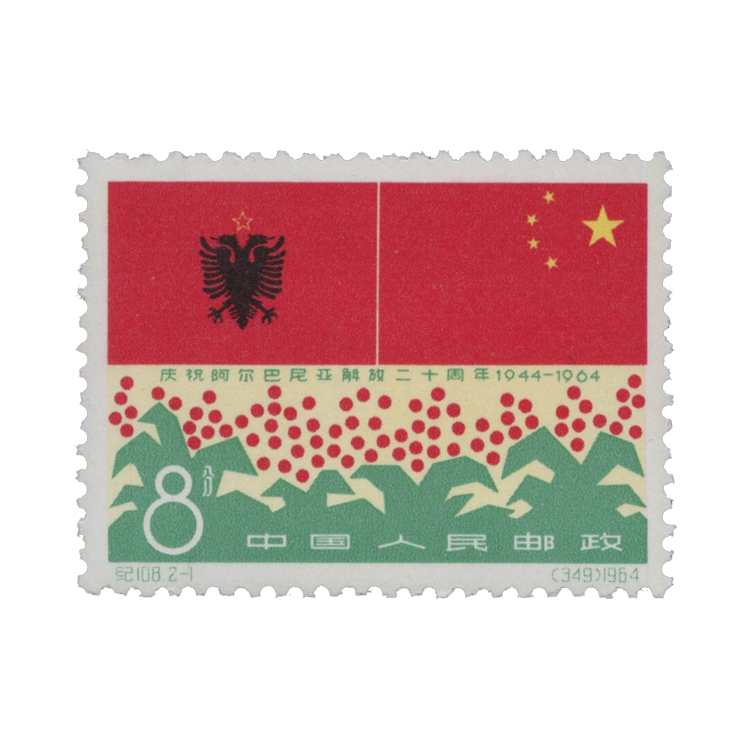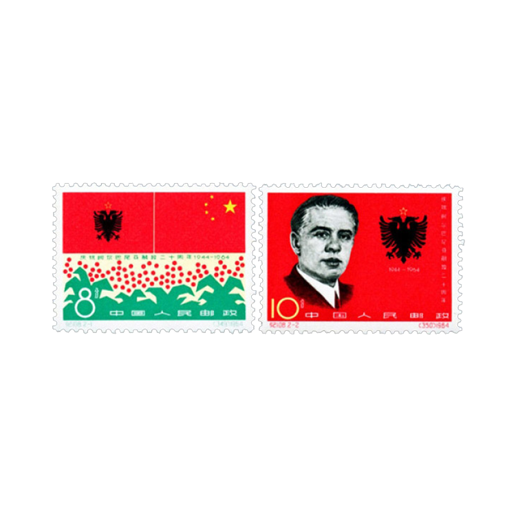 1964年11月29日,为纪念阿尔巴尼亚解放20周年,邮电部发行了《庆祝阿尔巴尼亚解放二十周年》纪念邮票,全套2枚。