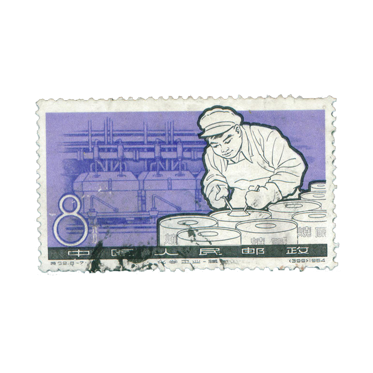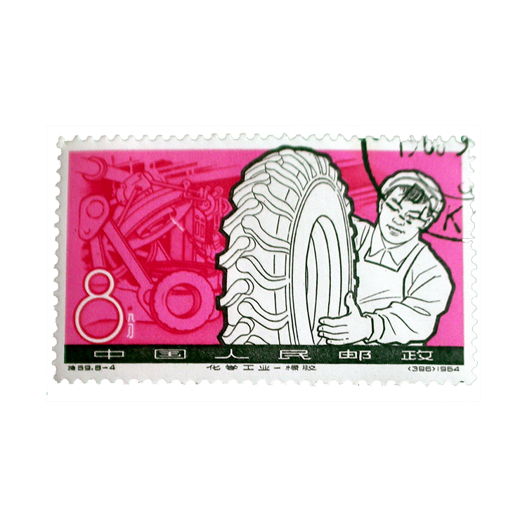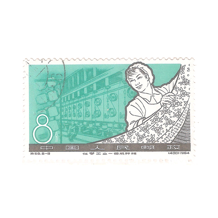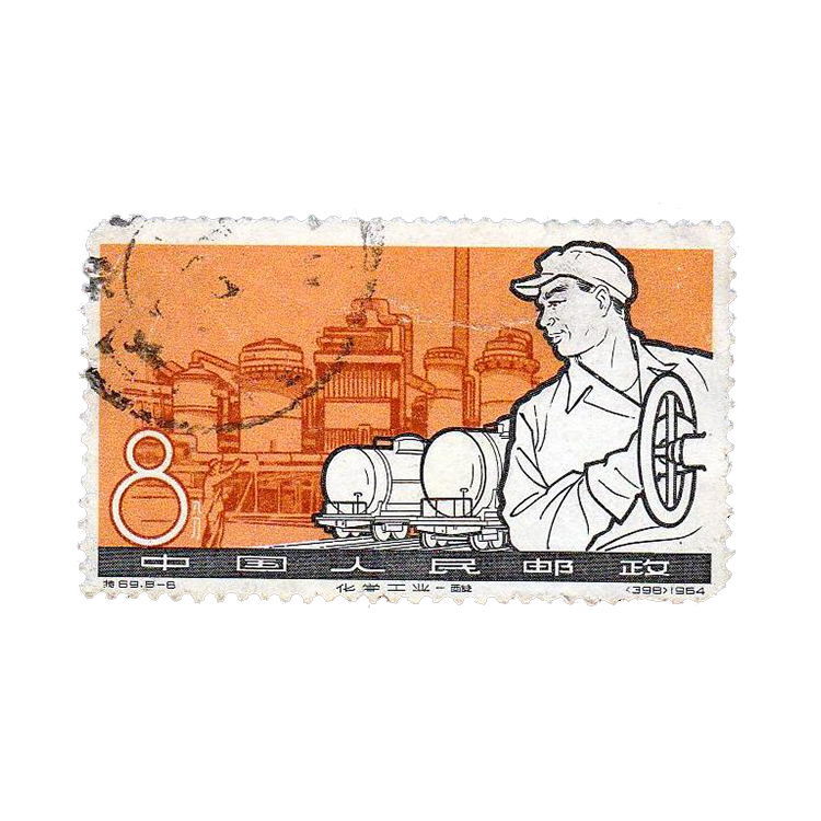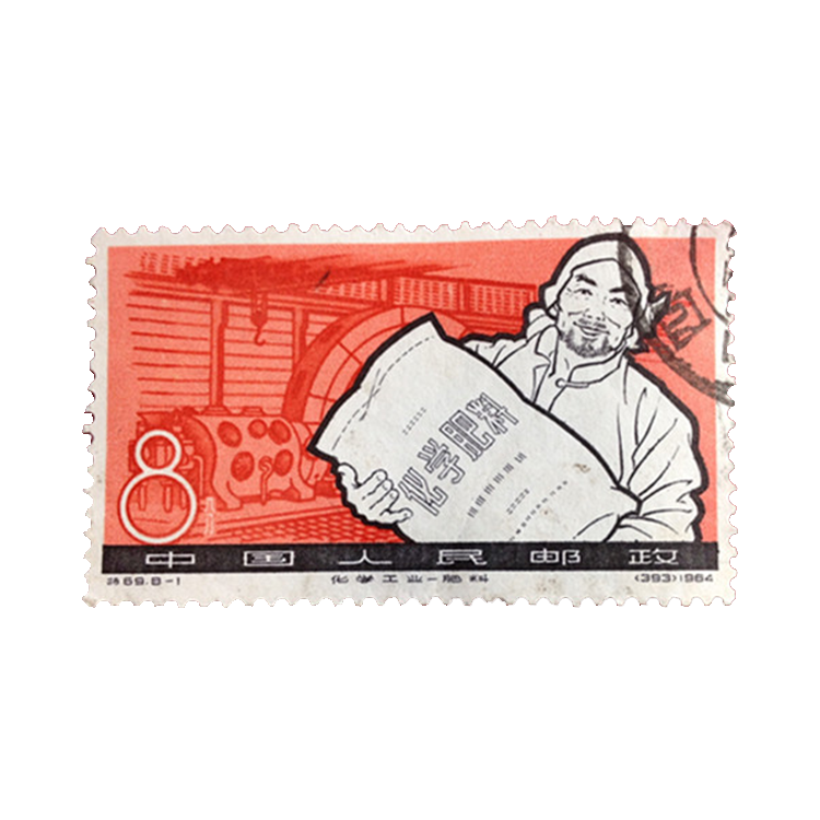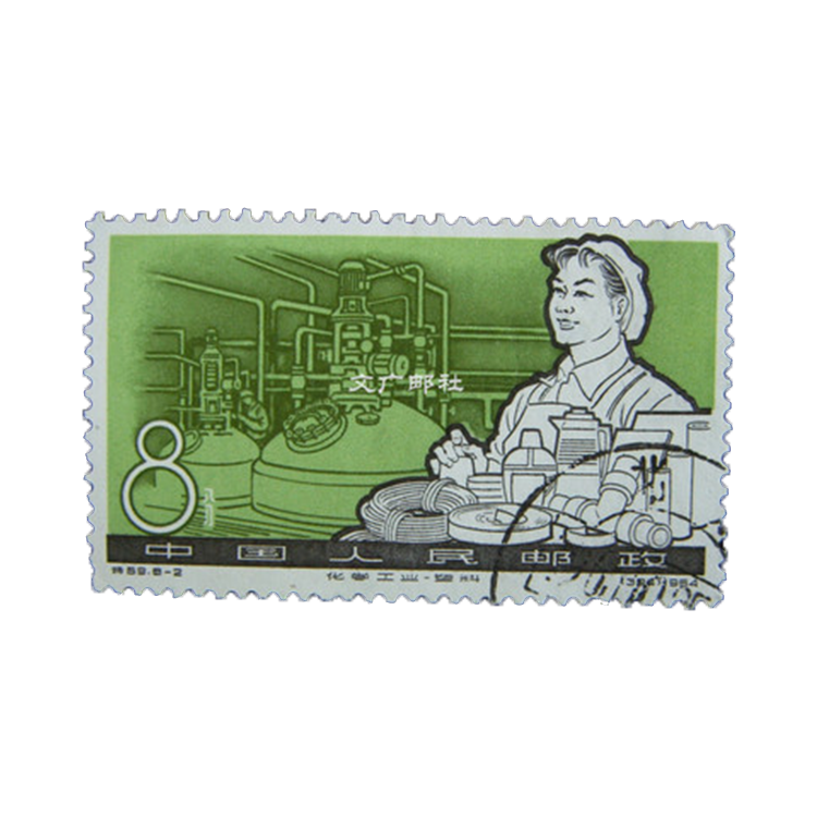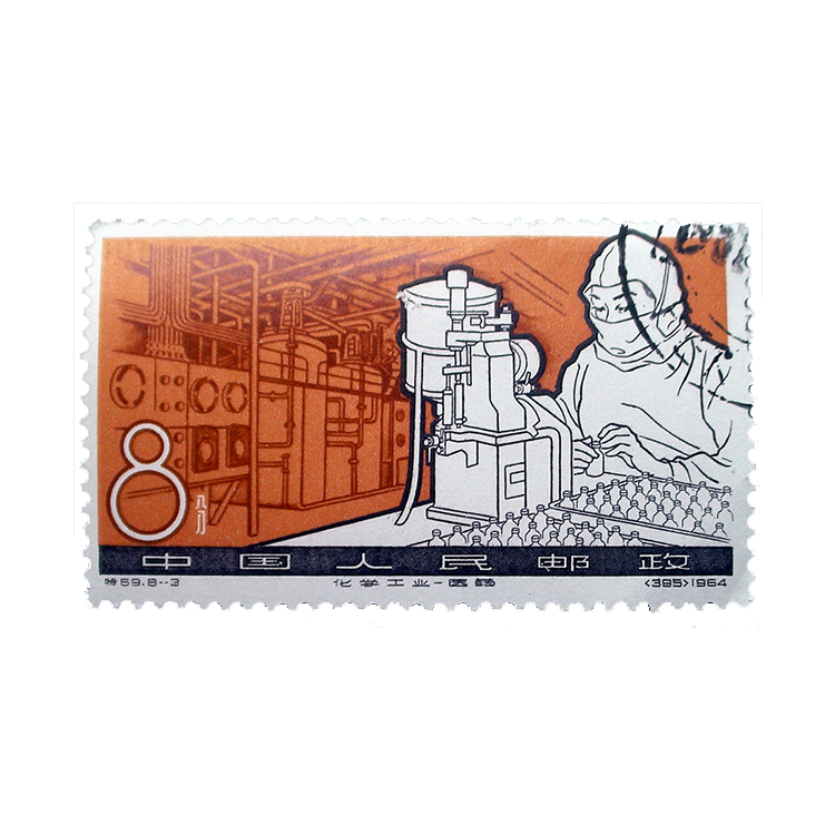 1964年12月30日,发行了一套“化学工业”特种邮票,共8枚,以反映中华人民共和国成立以来在化学工业取得的成就。本套邮票的图案设计采用了套色版画的形式,主图精雕细琢,黑白对比强烈。背景是与主图相关的化学工部门生产设备或厂房。