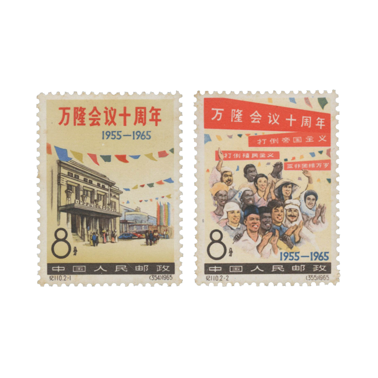 1965年4月18日,值此万隆会议10周年之际,为纪念这次历史性会议,邮电部发行了《万隆会议十周年》纪念邮票,全套2枚。
