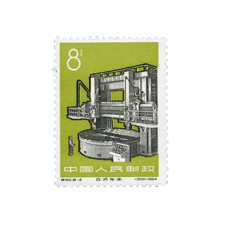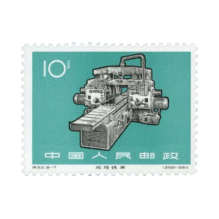 (357)为“自由锻造水压机”。图案是中国自行设计制造的第一台12000吨自由锻造水压机。这台万吨水压机有四根大立柱和上、中、下三个横梁,都是近百吨的大部件。该机能锻打二、三百吨重的特大钢锭,世界上只有很少几个国家能够生产。它的制造成功,标志着中国重型机器制造业跨入世界先进行列。