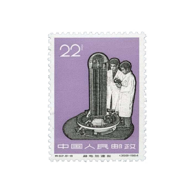 (359)为“静电加速器”。图案是电子静电加速器。它是由中国上海先锋电机厂与科研单位及高等学校共同协作试制成功的。它是进行原子能研究和辐射源应用的新型仪器。