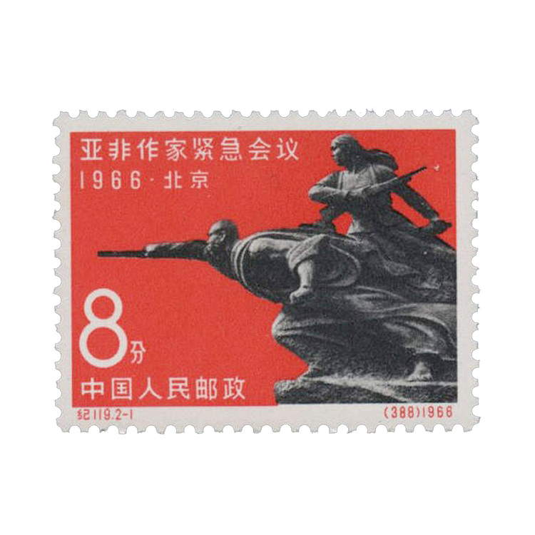 中国邮电部于1966年6月27日发行“亚非作家紧急会议”邮票,一套2枚。该邮票由邵柏林设计,北京邮票厂印制