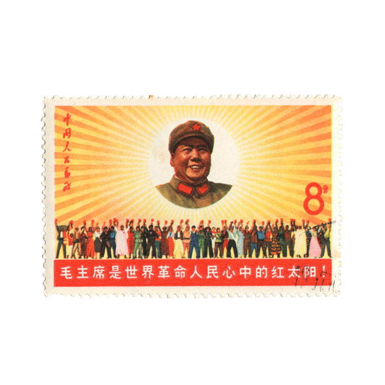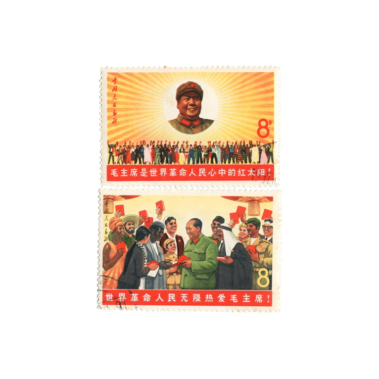1967年10月1日的国庆节为了凸显出毛泽东主席,特意发行了全套两枚的《毛主席与世界人民》“文”字头邮票。于是军管会就建议将《毛主席是世界革命人民心中的红太阳》这个宣传画作为邮票题材,这样就可以颂扬毛主席为了世界革命所作出的伟大努力。这两套邮票就是毛主席是世界革命人民心中的红太阳与毛主席和外国朋友。