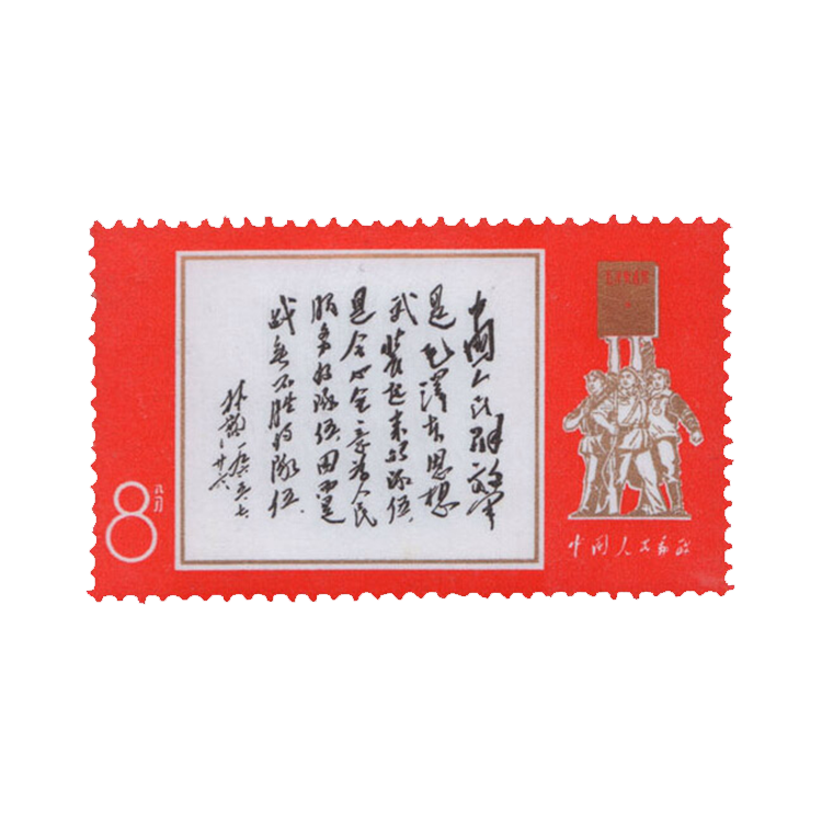 1927年8月1日,周恩来、贺龙等领导了南昌武装起义。这次起义是中国共产党独立领导武装斗争的开始。1933年6月30日,中共中央革命军事委员会发布《关于决定“八·一”为中国工农红军成立纪念日决议》。本套邮票共1枚。画面为当时的中华人民共和国国防部部长林彪为发行这套邮票题词手迹。题词原文是:“中国人民解放军是毛泽东思想武装起来的队伍,是全心全意为人民服务的队伍,因而是战无不胜的队伍。——林彪”。