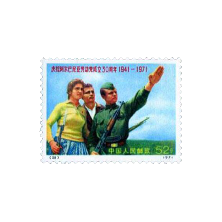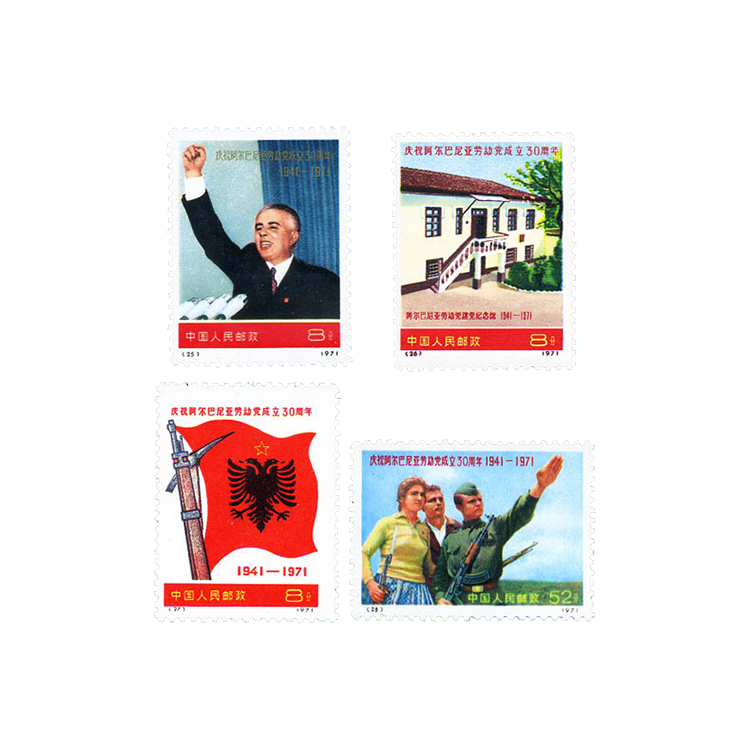 1971年11月8日,为庆祝阿尔巴尼亚劳动党成立30周年,交通部邮政总局发行了《庆祝阿尔巴尼亚劳动党成立三十周年》邮票,全套4枚。